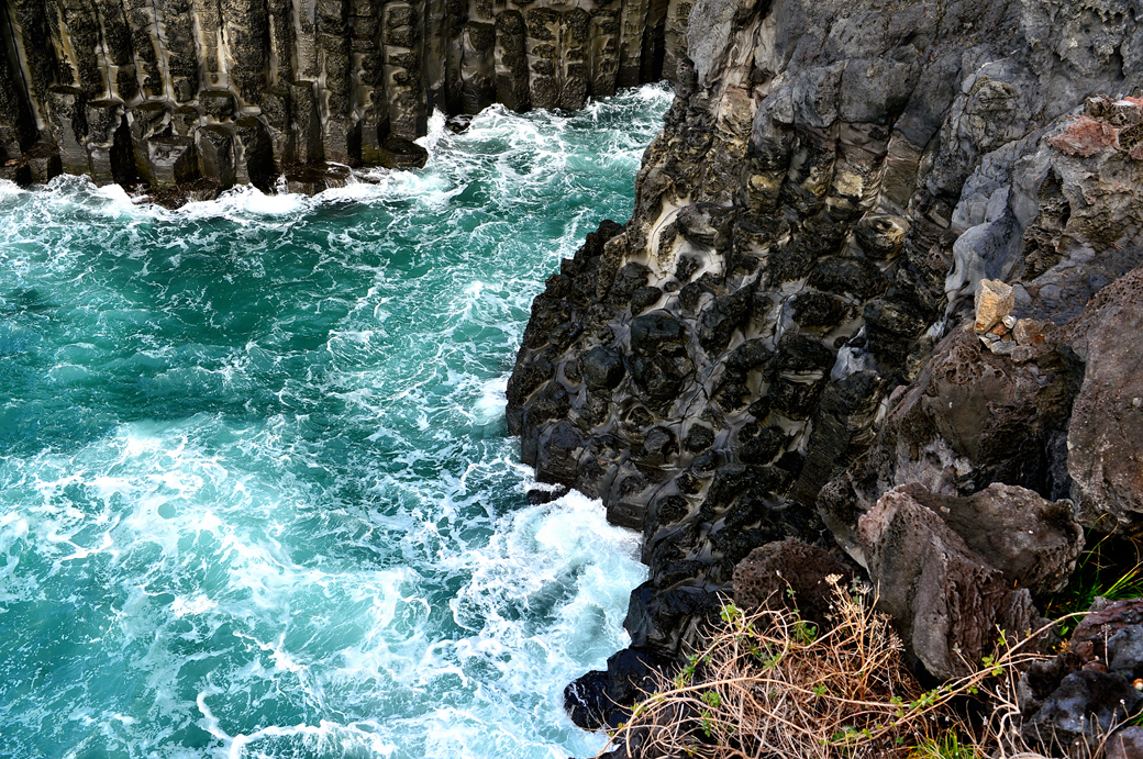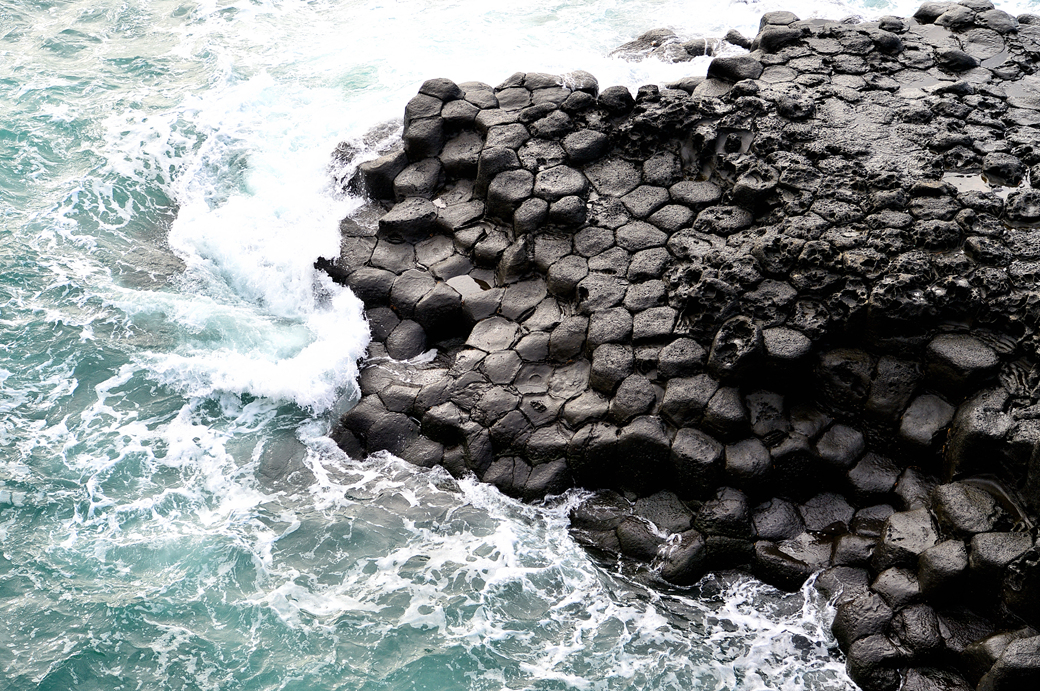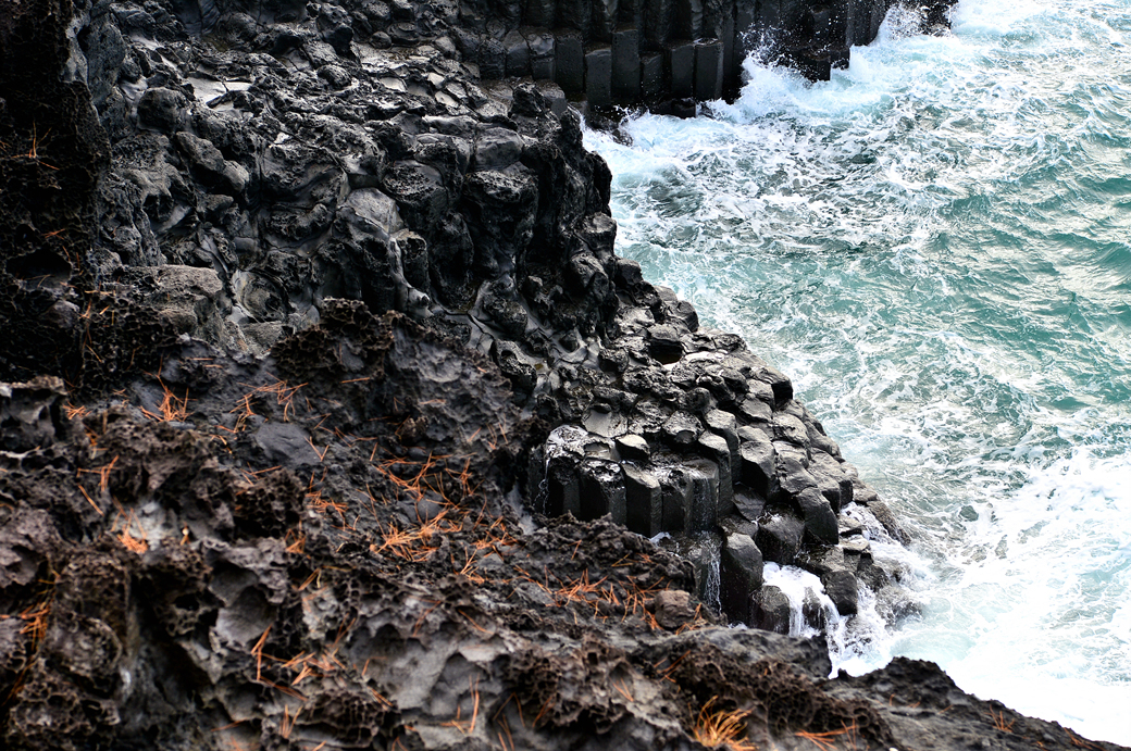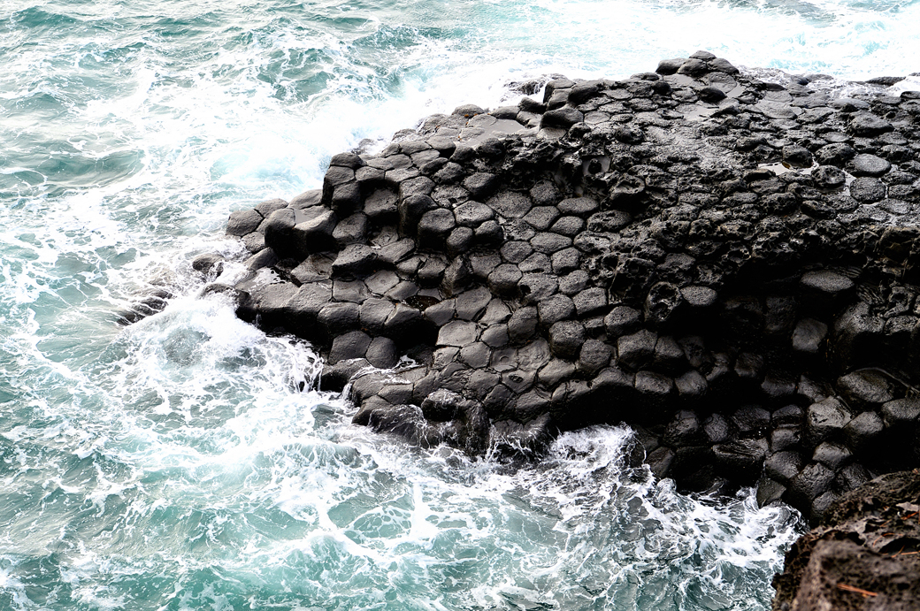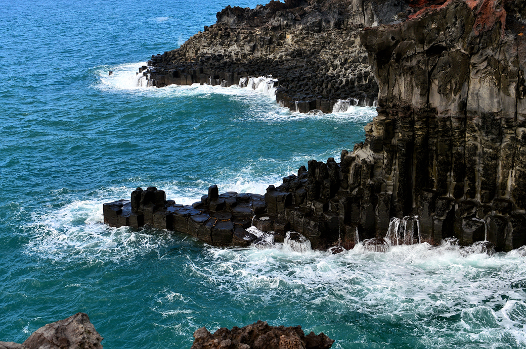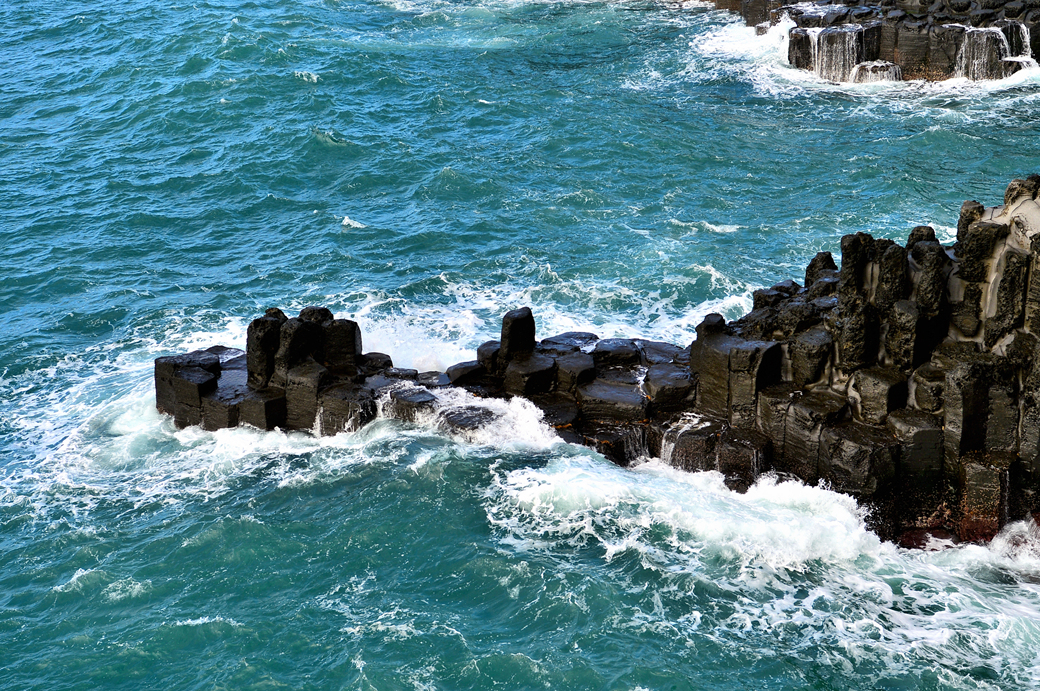파도에 잠겼다가 벗어나길 반복하는 주상 절리대의 다각형 머리가 멋지다.