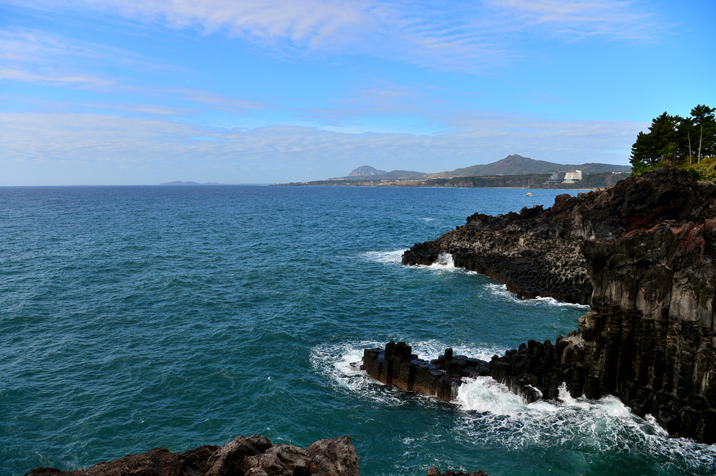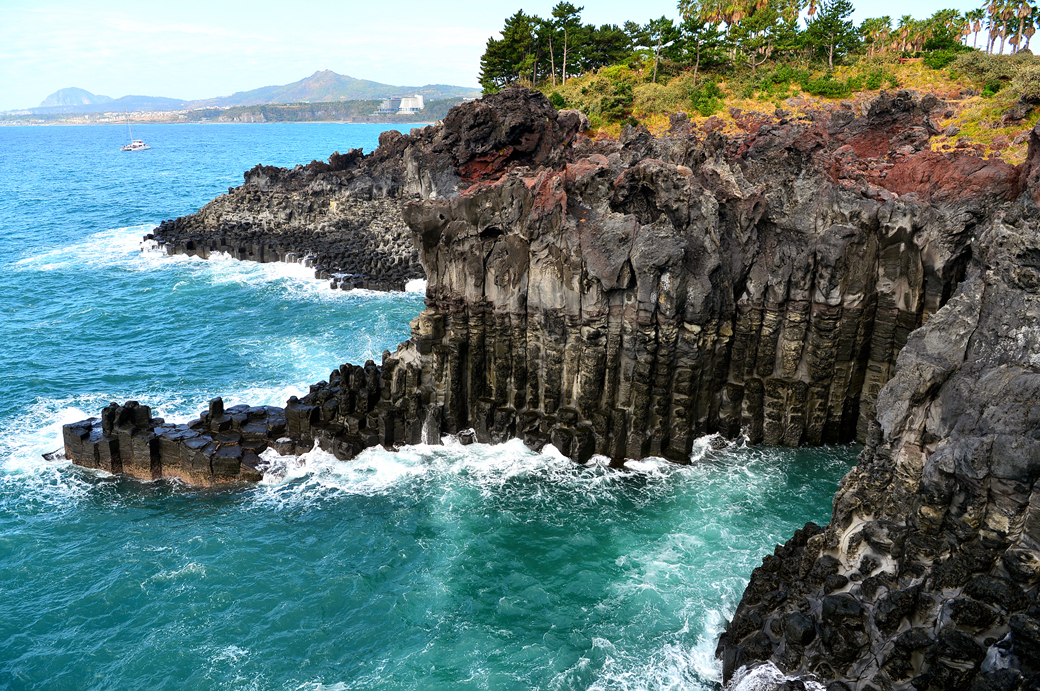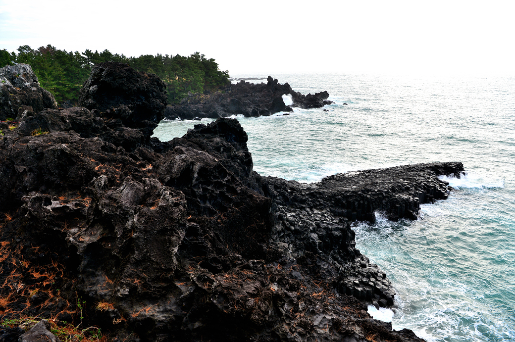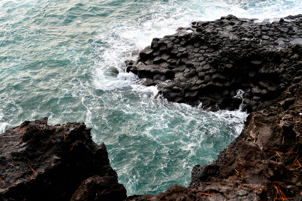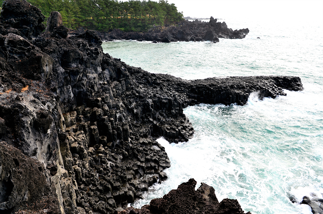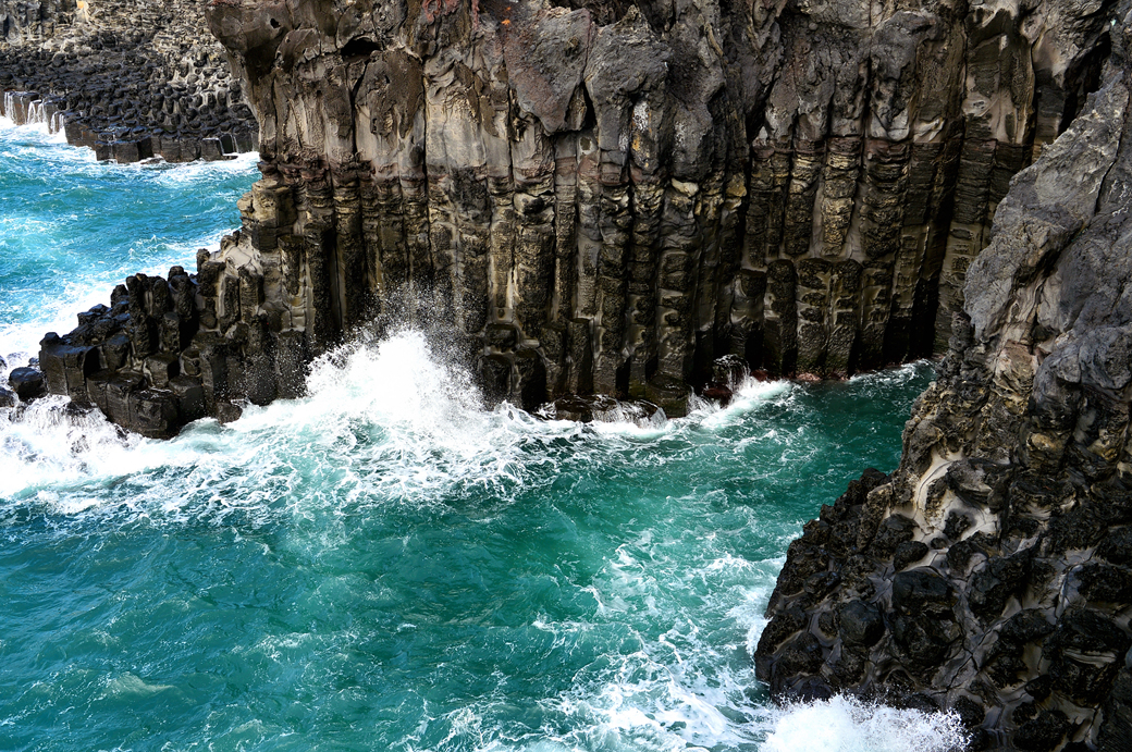 파도에 잠겼다가 벗어나길 반복하는 주상 절리대의 다각형 머리가 멋지다.