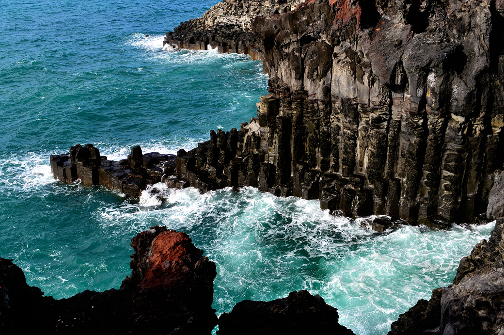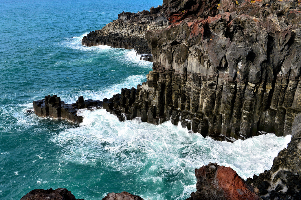 주상 절리는 화산 분출 후 용암 표면의 균등한 수축으로 수직 방향으로 생겨난 돌기둥을 뜻하는데, 해안가의 용암이