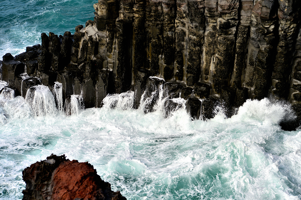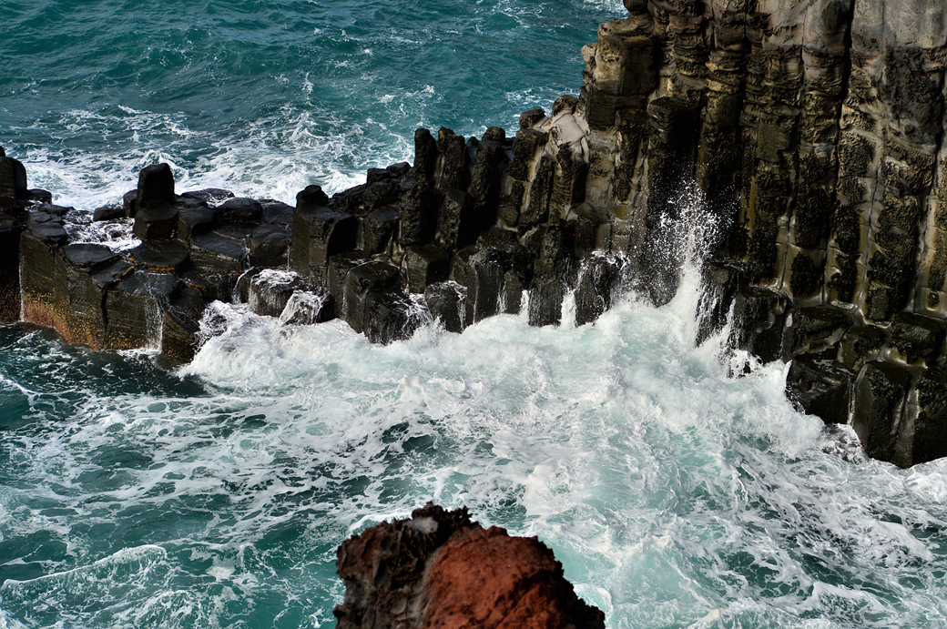 주상 절리대와 부딪쳐 부서지는 파도와 절리대가 아름다운 풍경을 연출하고 있다.
