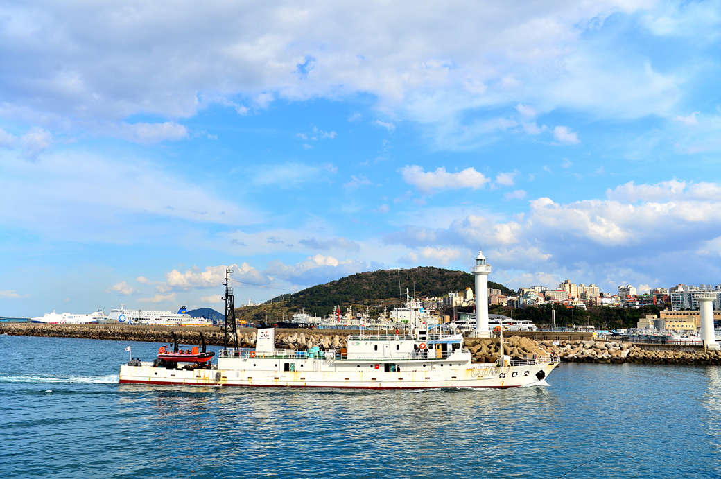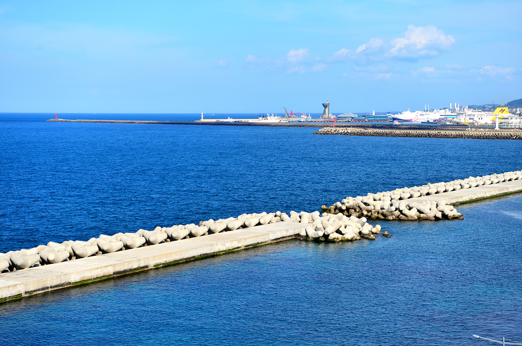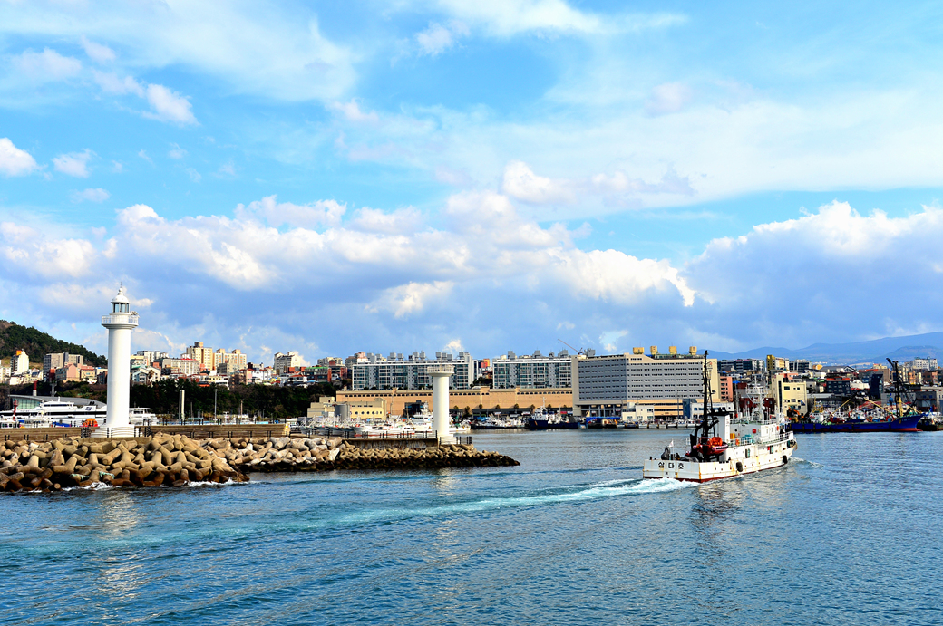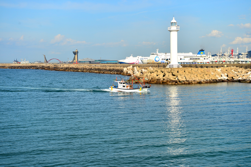 항구로 들어가는 배와 항구가 만들어 낸 풍경이 아름답다.