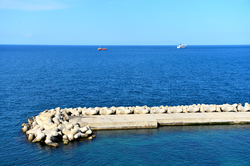 방파제 너머로 바다 위에 떠있는 배들도 보이고, 방파제 끝의 등대도 보인다.