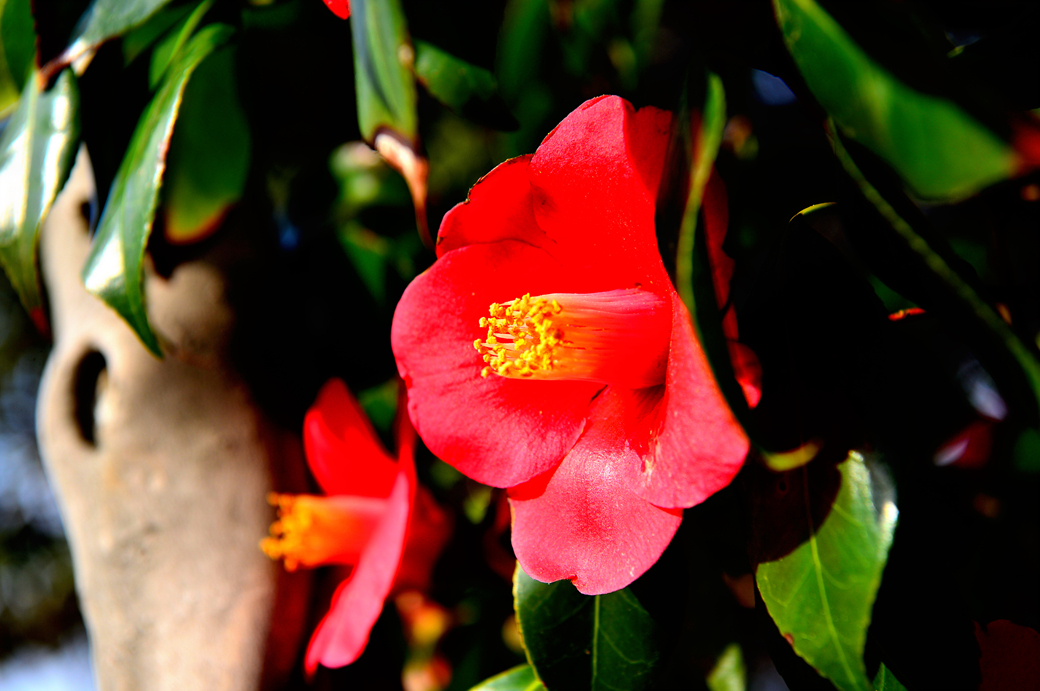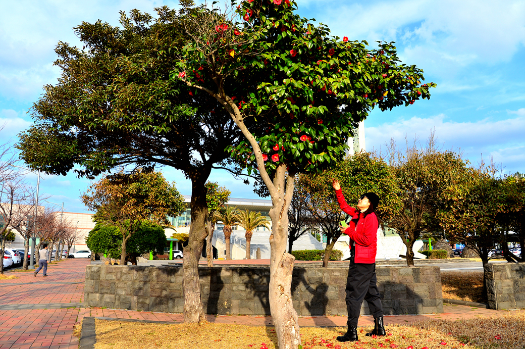 광장의 동백나무가 아름다운 빨간 꽃을 선보이고 있다.