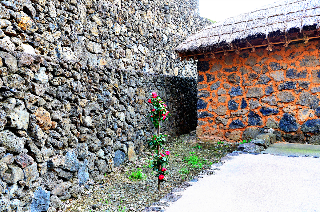 뜰의 돌담 아래에는 동백꽃도 피어 있고~