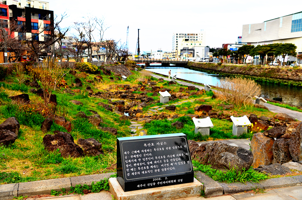 산지천 옆에 흑산호 가공소라는 표지판이 세워져 있다.