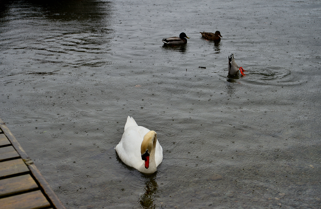 빗방울이 제법 거세어지는데 오리들과 백조만 천하태평이구나~