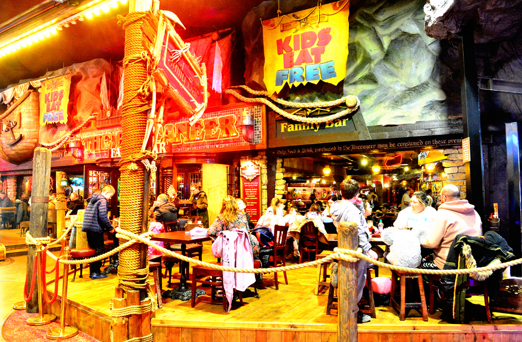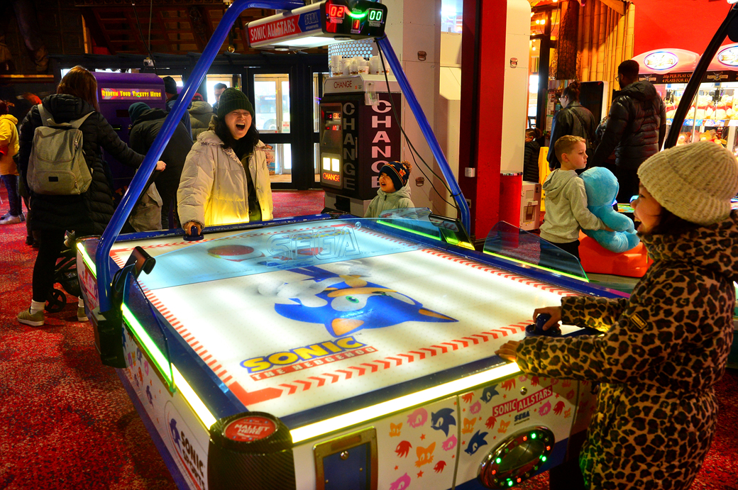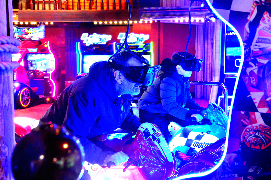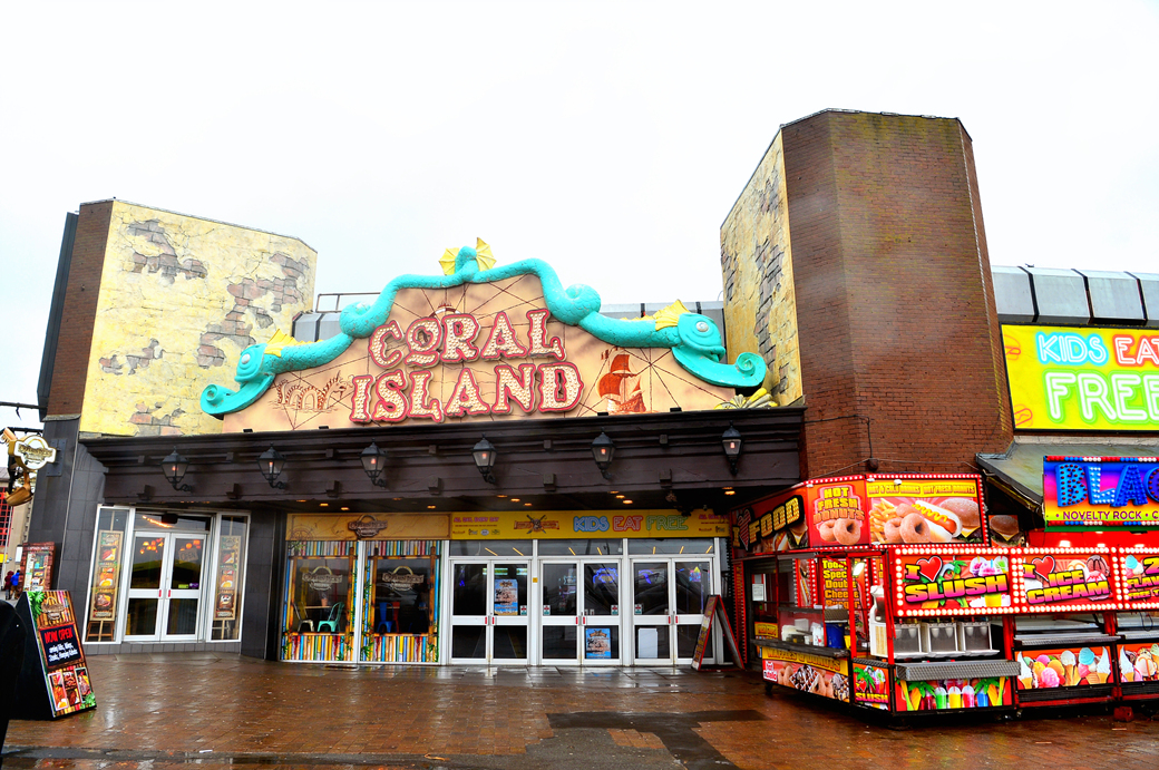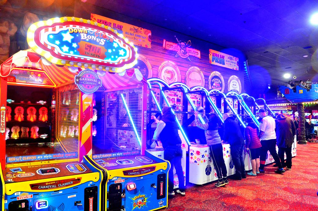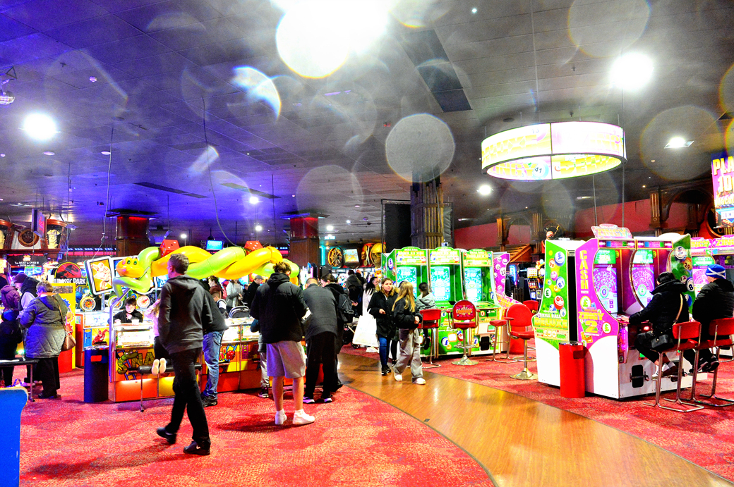 복싱 글로브와 같은 형태의 옥내 대형 풀장 샌드 캐슬과 화려한 색의 큰 간판이 걸려 있는 놀이동산 아케이드,