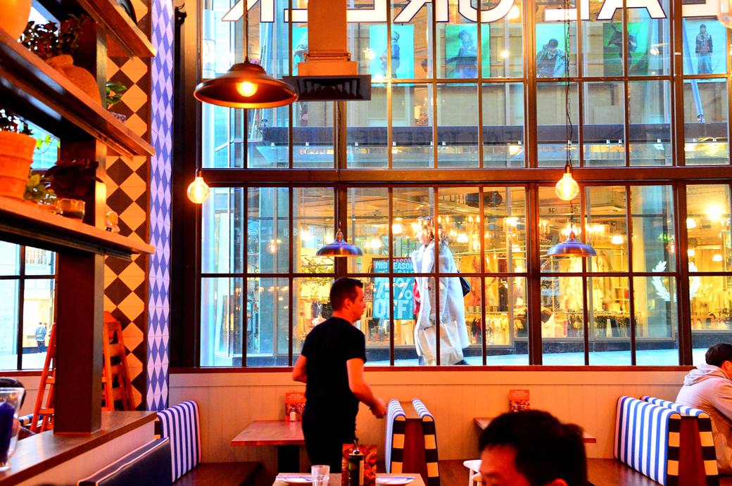창밖으로는 거리가 내다 보이고, 천정 등이 무척 이색적이다.