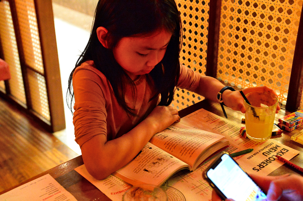 메뉴를 고른 손녀는 곧장 책 읽기에 몰두한다.