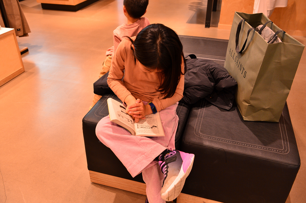 옷 가게에 들어갔는데도 울 손녀의 시선은 온통 책에 푹 빠져 있다.