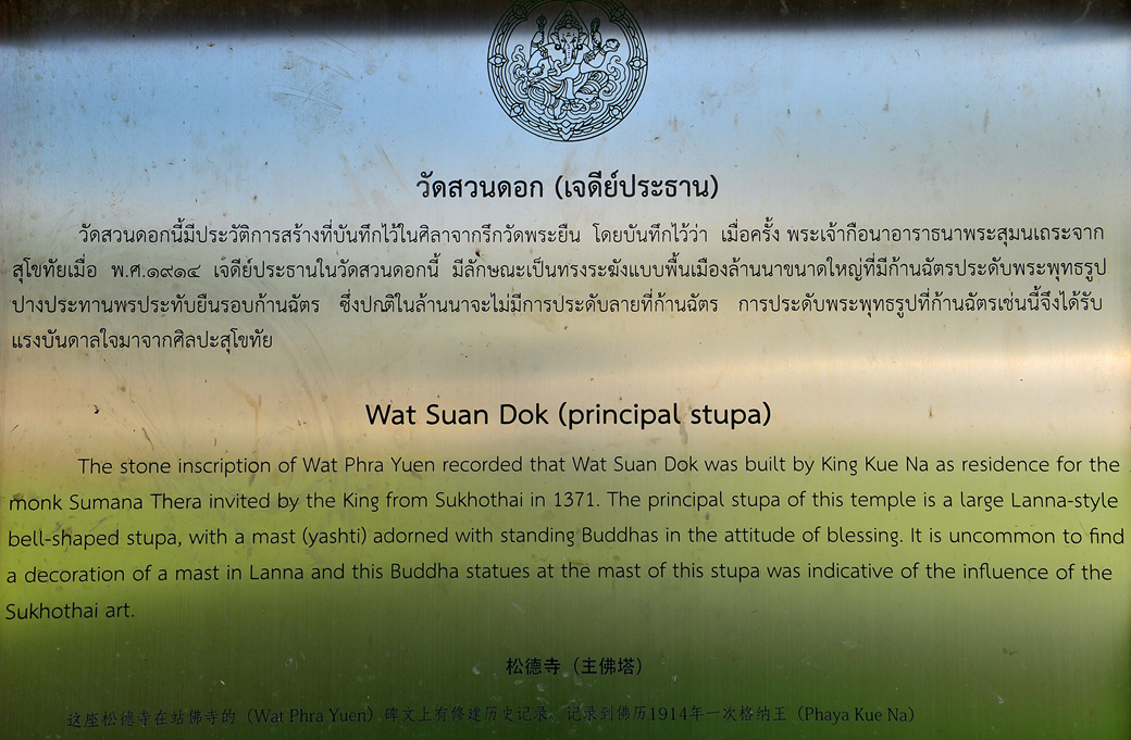 왓 프라 유엔의 석비에는 왓 수안독은 1371년 쿠에나 왕이 수코타이에서 초대한 테라 승려를 위한 거처로 건립