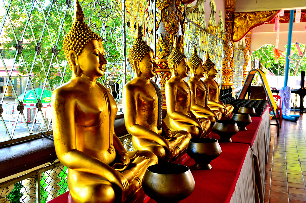 불전 안에 황금빛 불상을 일렬로 나열해 놓은 모습도 보인다.