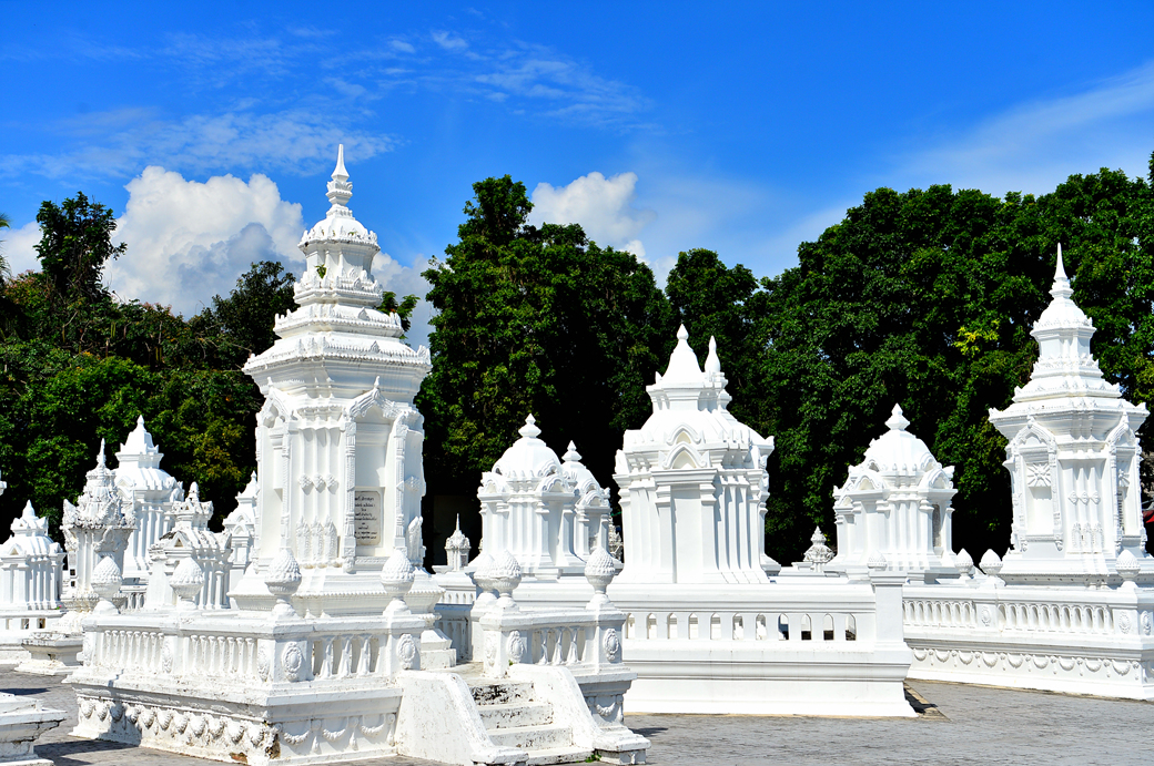 크고 작은 흰색의 체디 사이에 우뚝 서있는 커다란 황금색 체디는 수코타이 양식이라고 하며, 흰색의