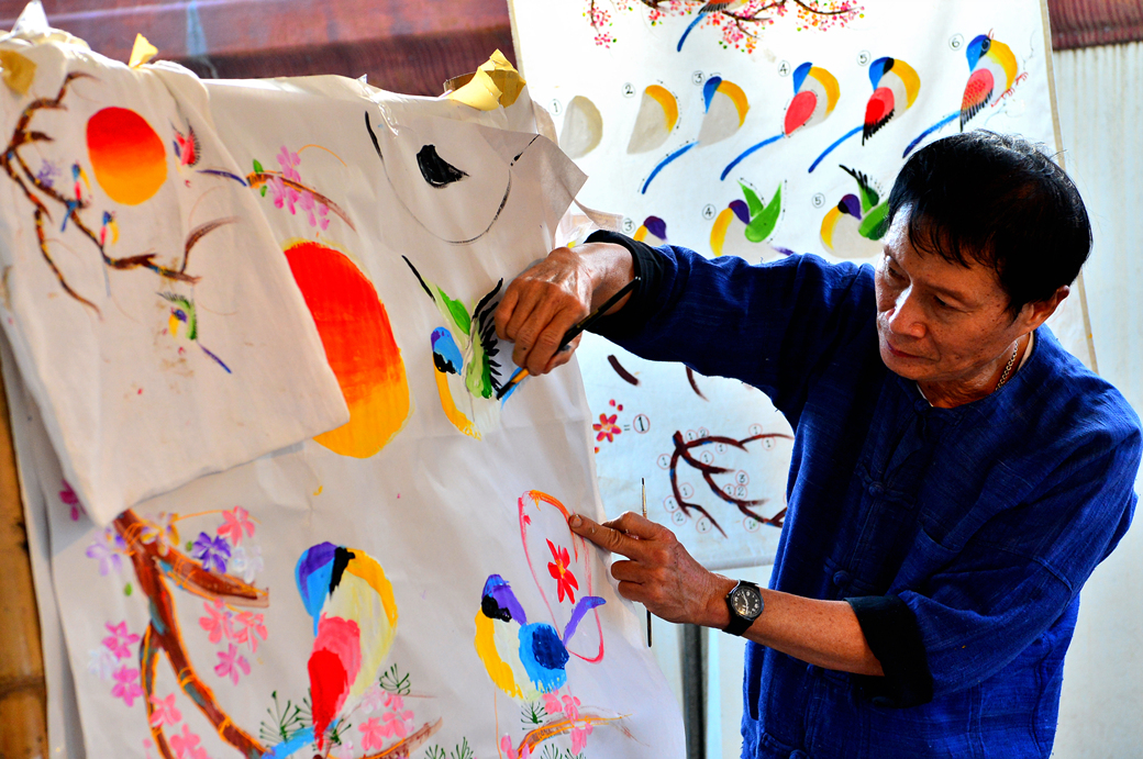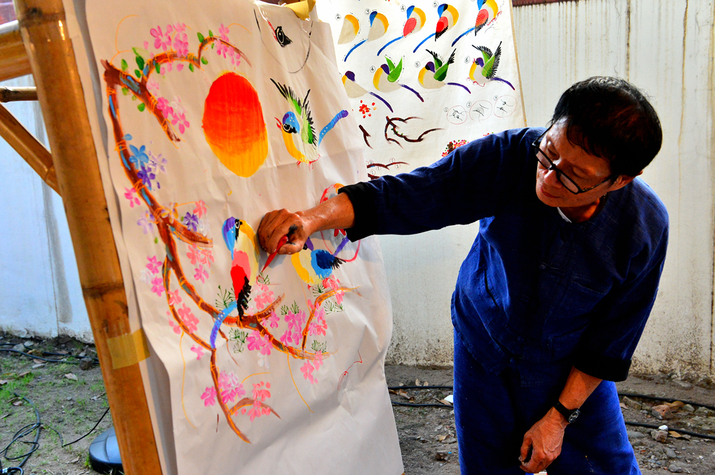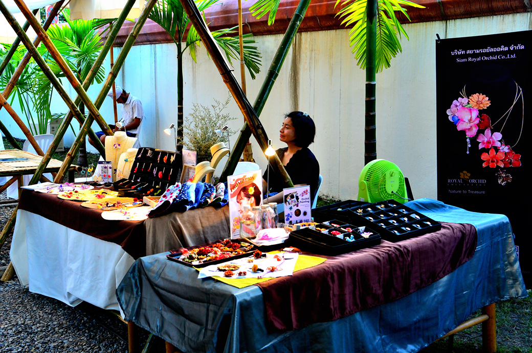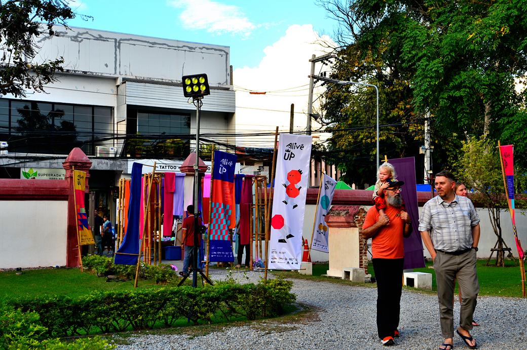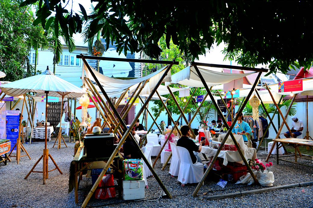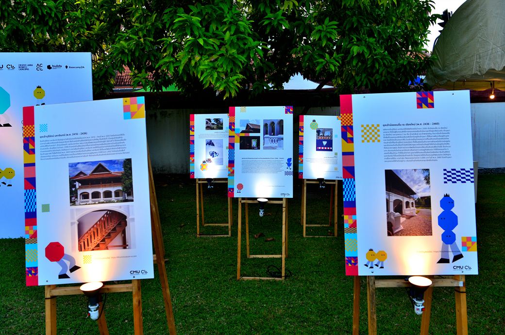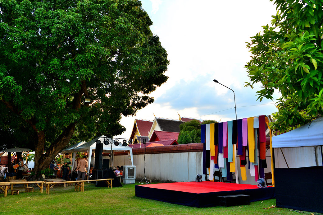 작은 무대 뒤는 아름다운 오색 천으로 장식되어 있고, 무대 앞 공간에는 란나 스타일의 각종 건축물들의 사진과