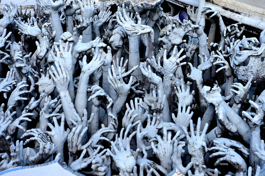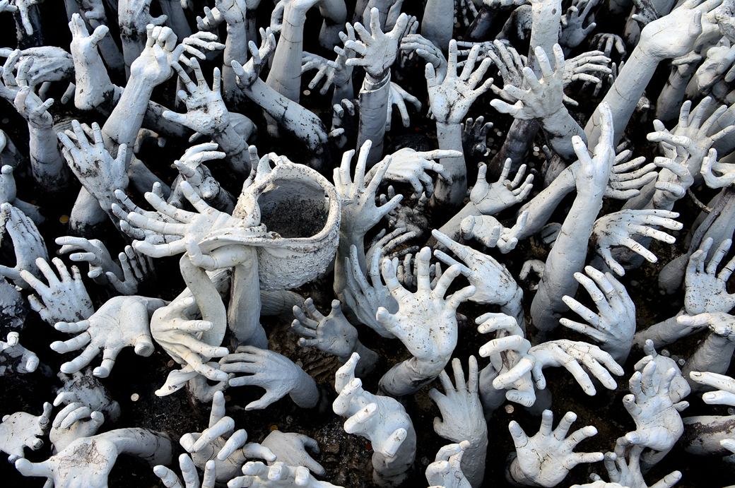 지옥 불에서 살아남기 위해 무엇이든 잡으려 애쓰는 인간의 모습, 처절하고도 절실하게 뻗치는 수많은 손 조각이