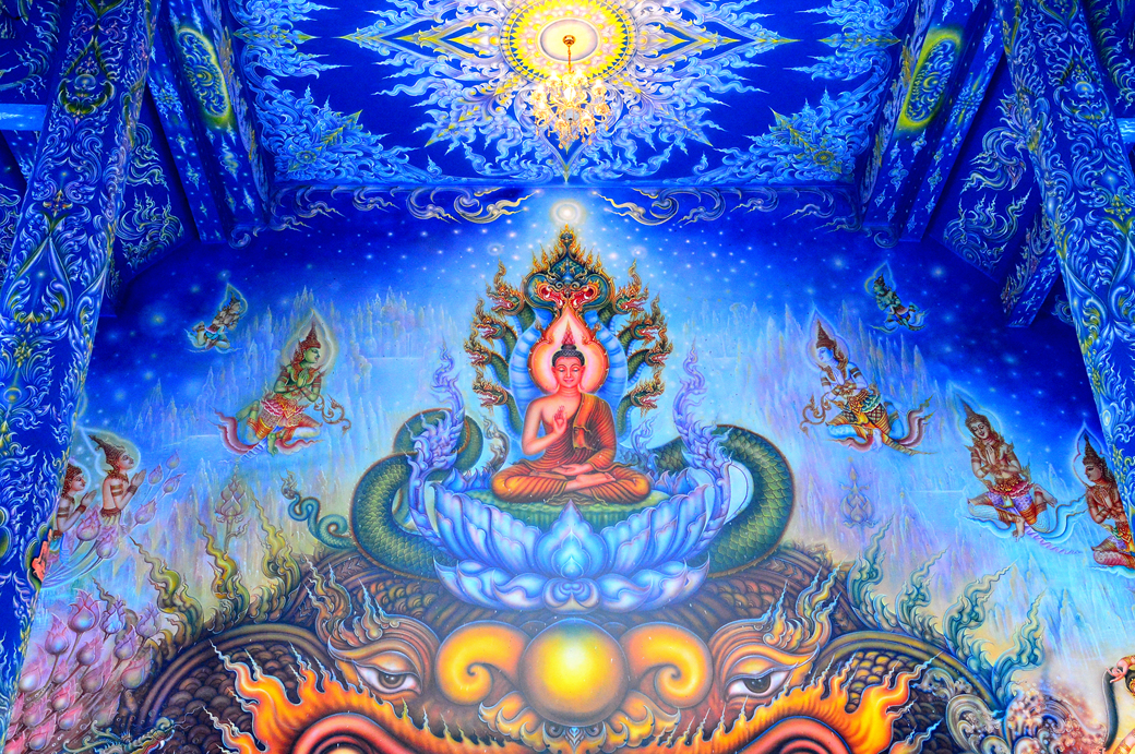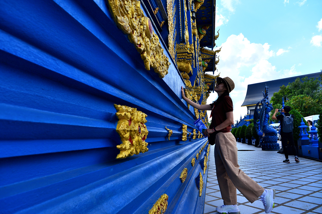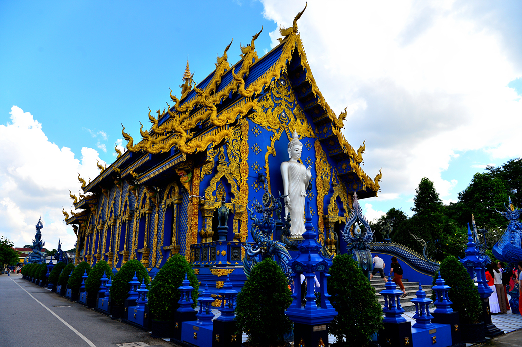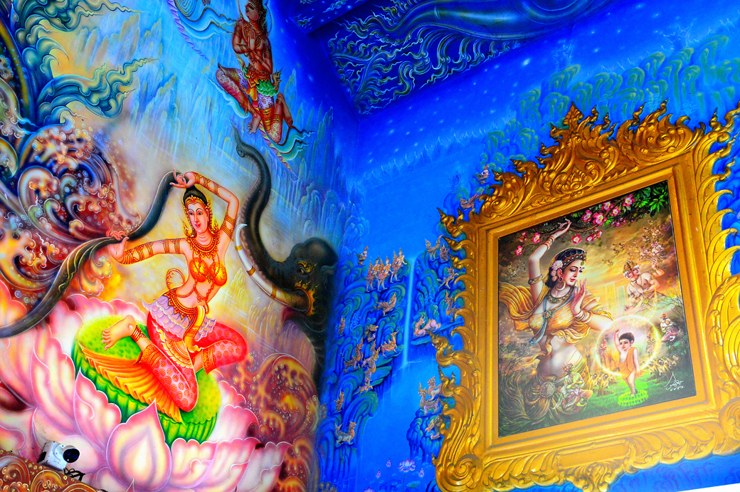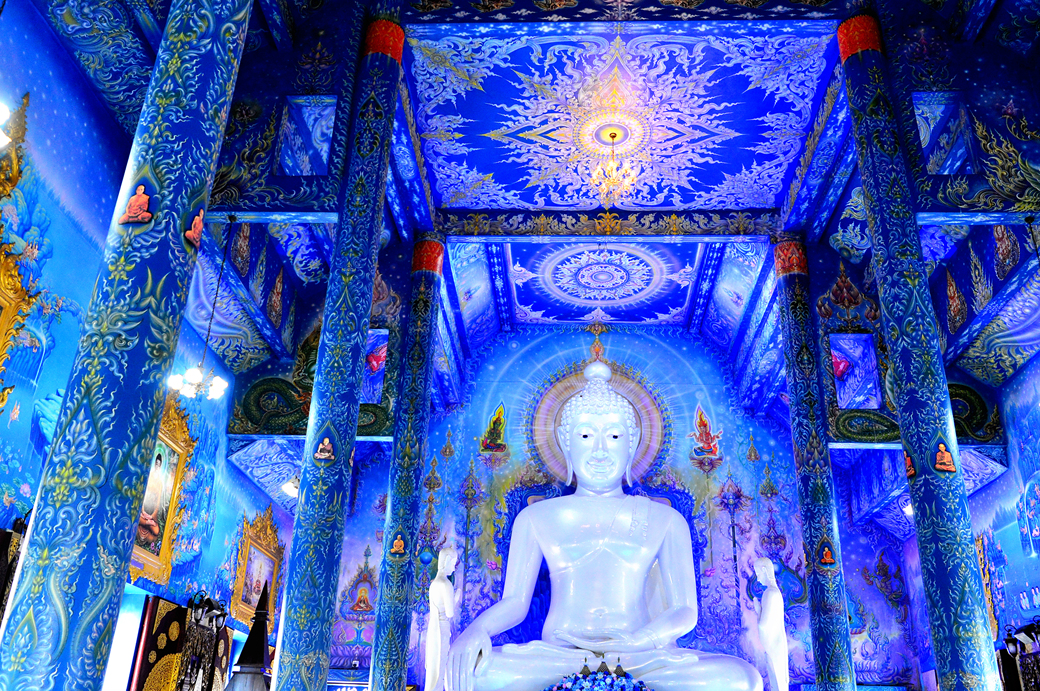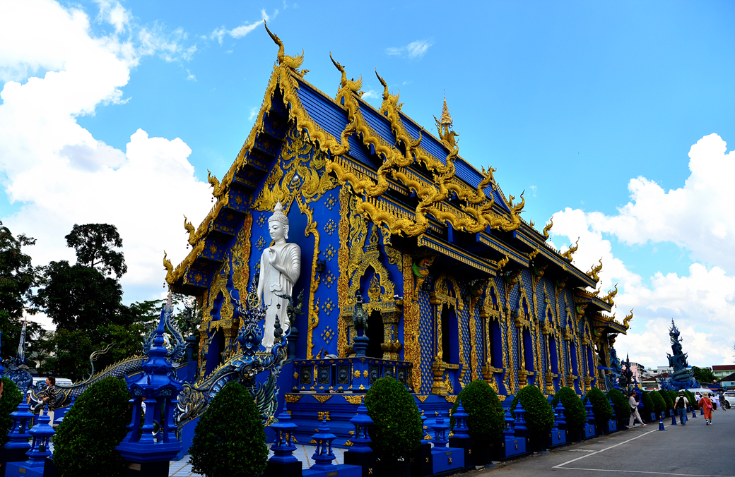 사원 안팎으로 모두 파란색이 주류를 이루는데, 본전은 환상적인 분위기의 불교 신화 벽화와 파란색 조각품이