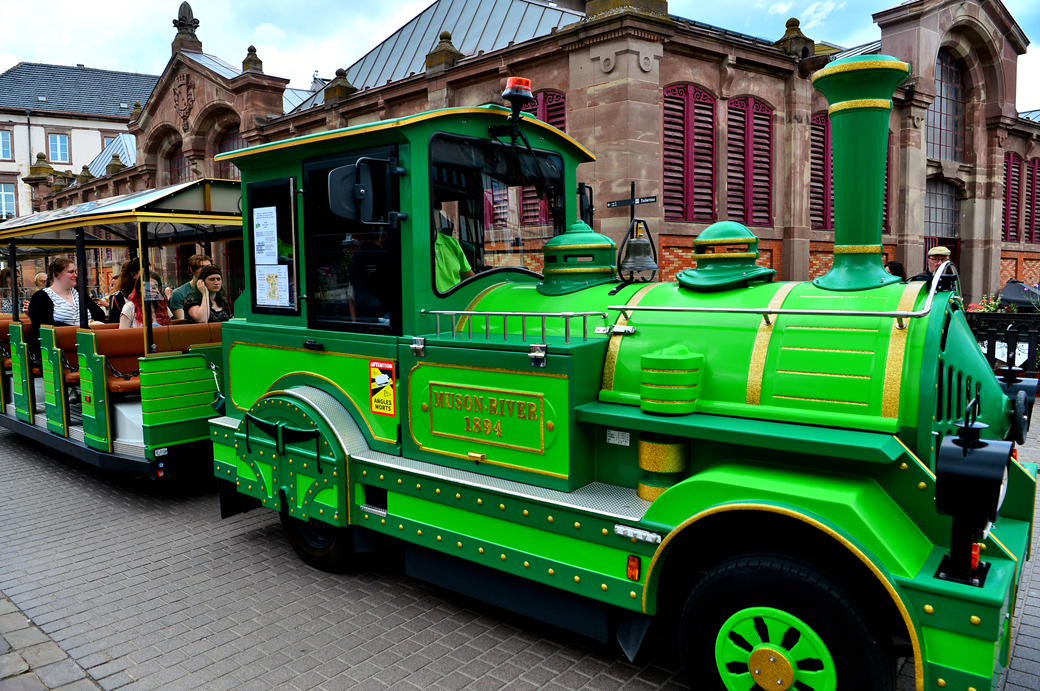 시장 건물 옆을 관광객을 태운 하얀 꼬마 기차가 지나고 있다.