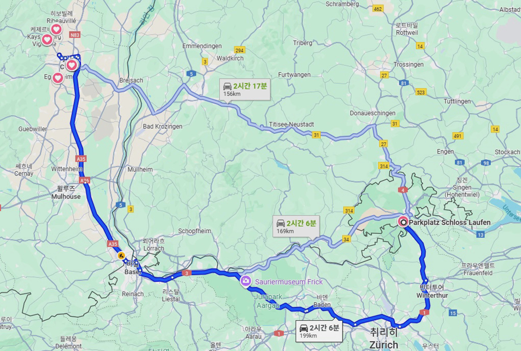 다음날 콜마르를 나서서 라인 폭포로 가는 경로인데, 200km 가까운 거리에 2시간이 넘게 걸린다.