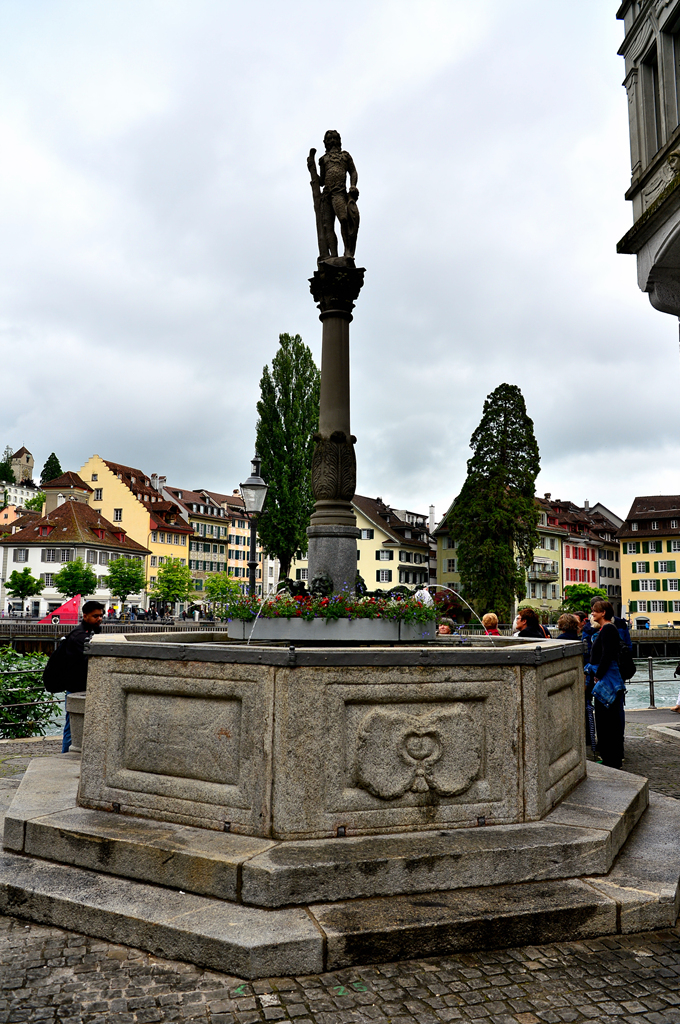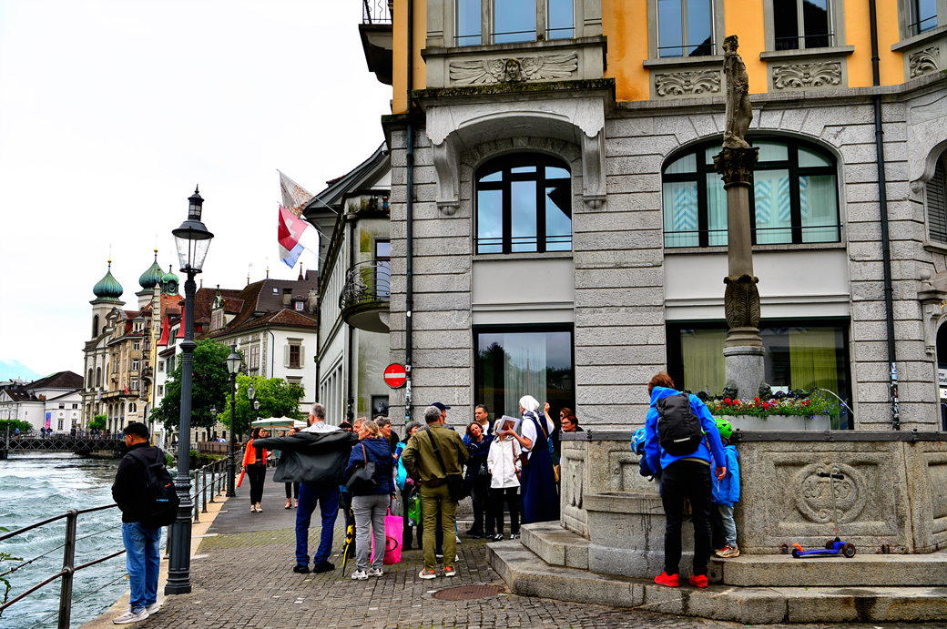 좁은 강변길에서 만난 석조물 앞에서 열심히 설명을 듣고 있는 일련의 관광객 모습이 보이는데, Jesuitenbrunnen, Luzern이라 불리는 이 석조물은 스위스 도시의 전형적인 더위를 식히거나 물을 마실 수 있는 많은 분수 중 하나라고 한다.