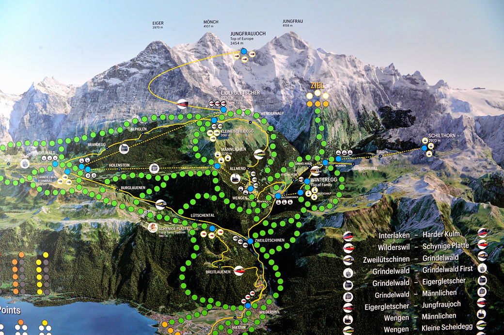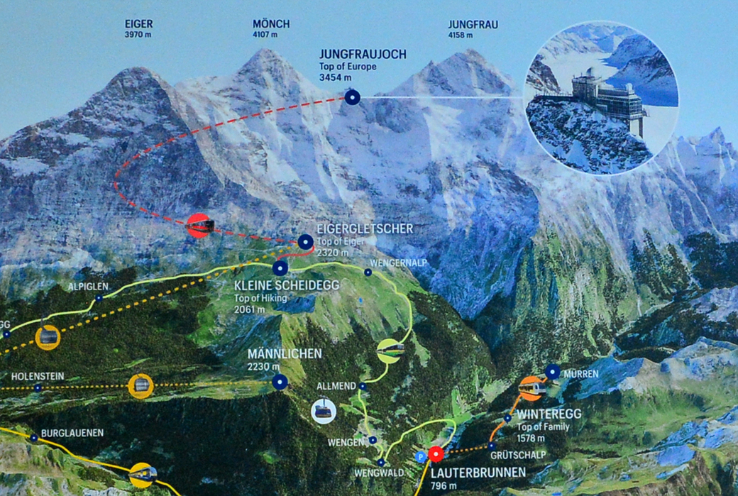 올라오면서 보았던 세 봉우리와 내일 올라갈 융프라우요흐가 잘 표현된 안내도다.
