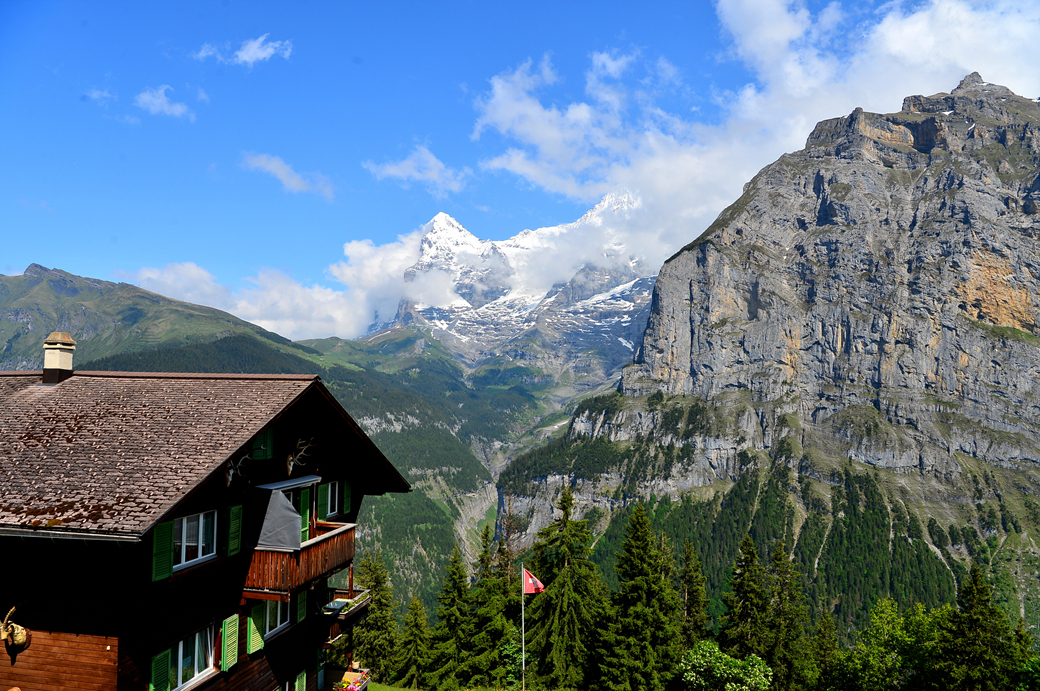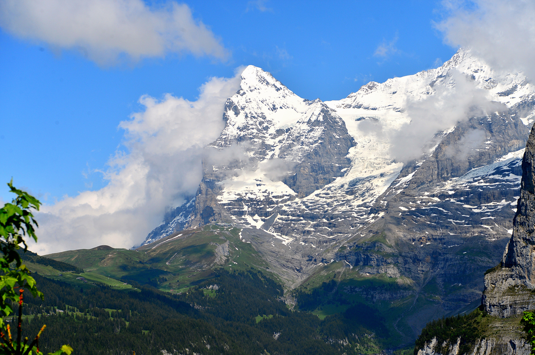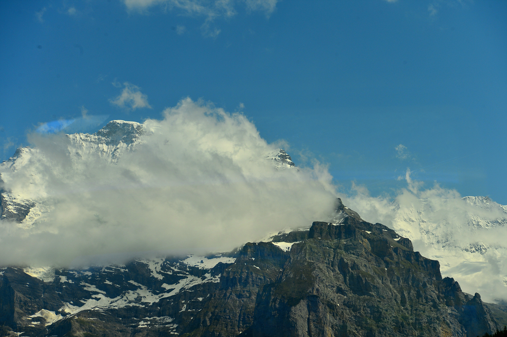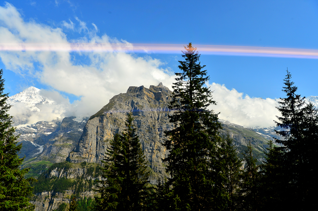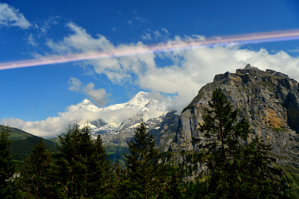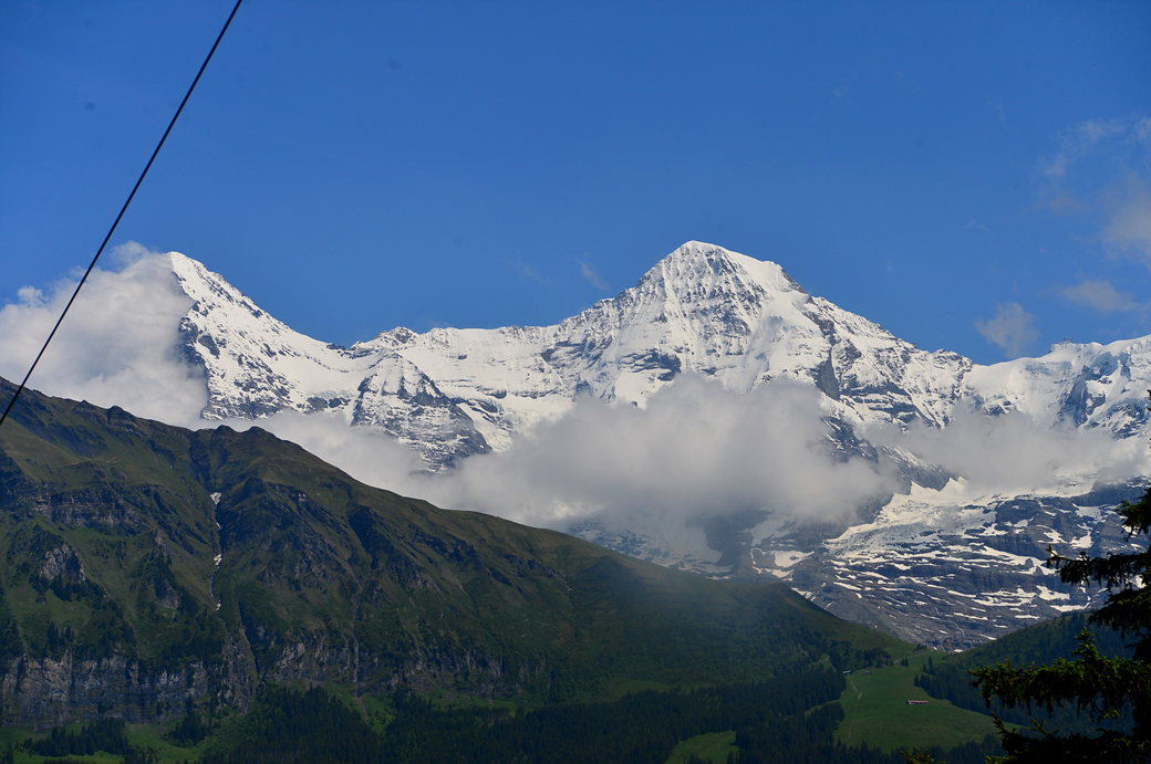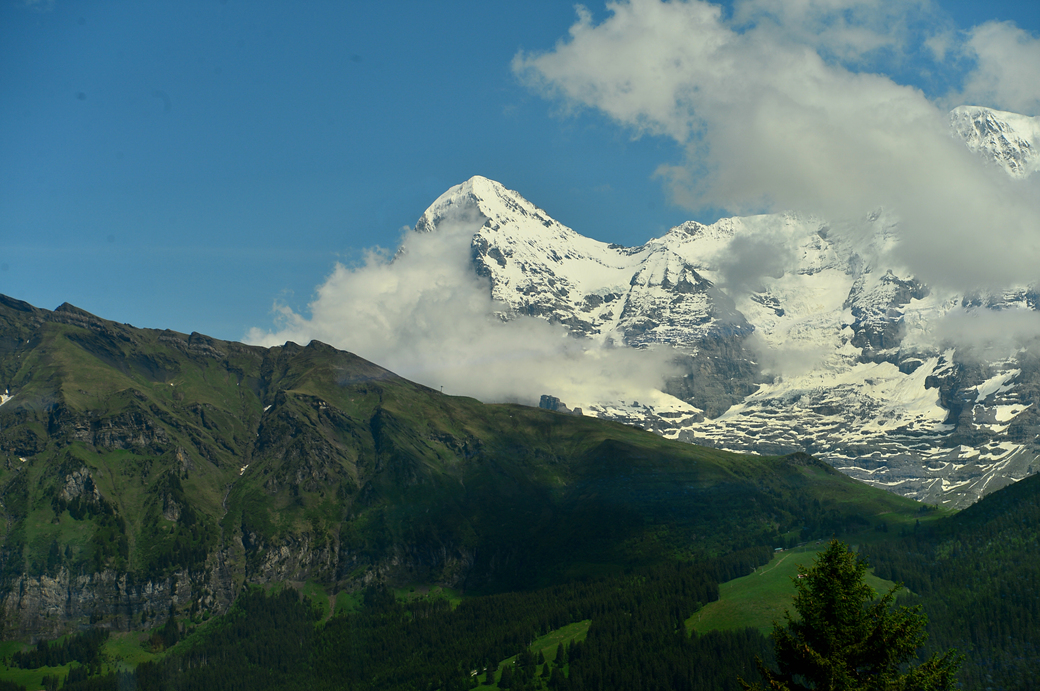 나무들과 암봉에 가려진 융프라우는 그 모습을 쉽게 드러내 보이질 않는다.
