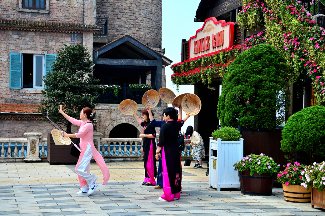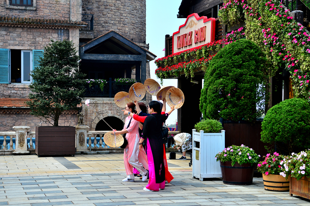 베트남 전통 의상 아오자이를 잘 차려입고 기념사진 남기기에 여념이 없는 여인들이 보인다.