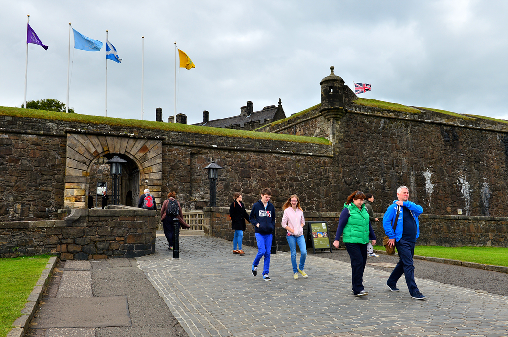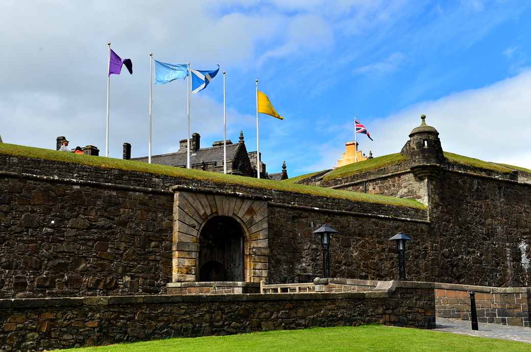 파란색 바탕에 하얀 십자가가 그려진 스코틀랜드 국기 아래로 성으로 들어서는 주출입구가 있다.