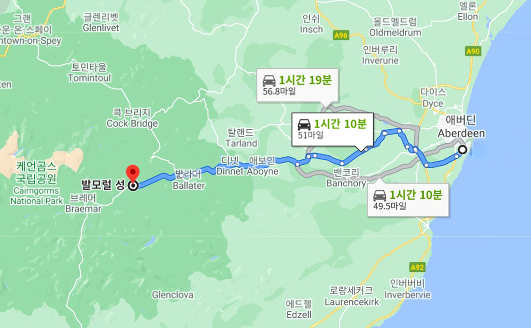 아버딘에서 한 시간 이상을 달려와야 한다.