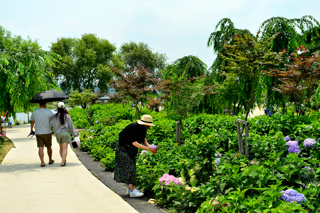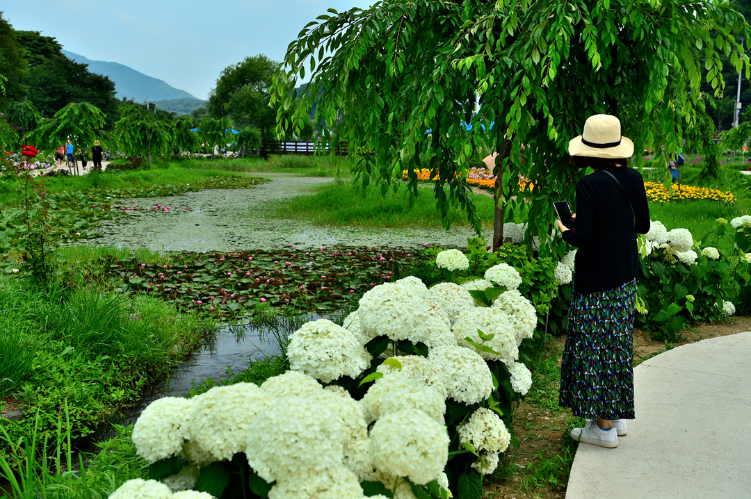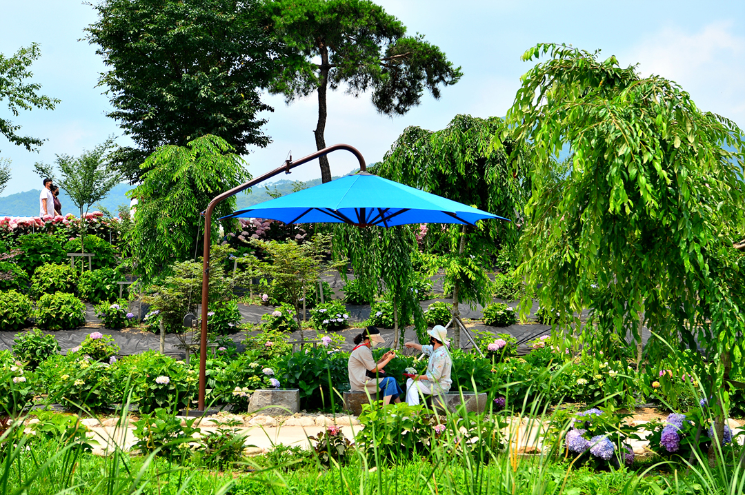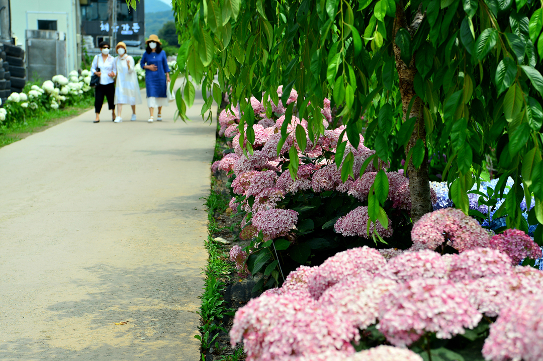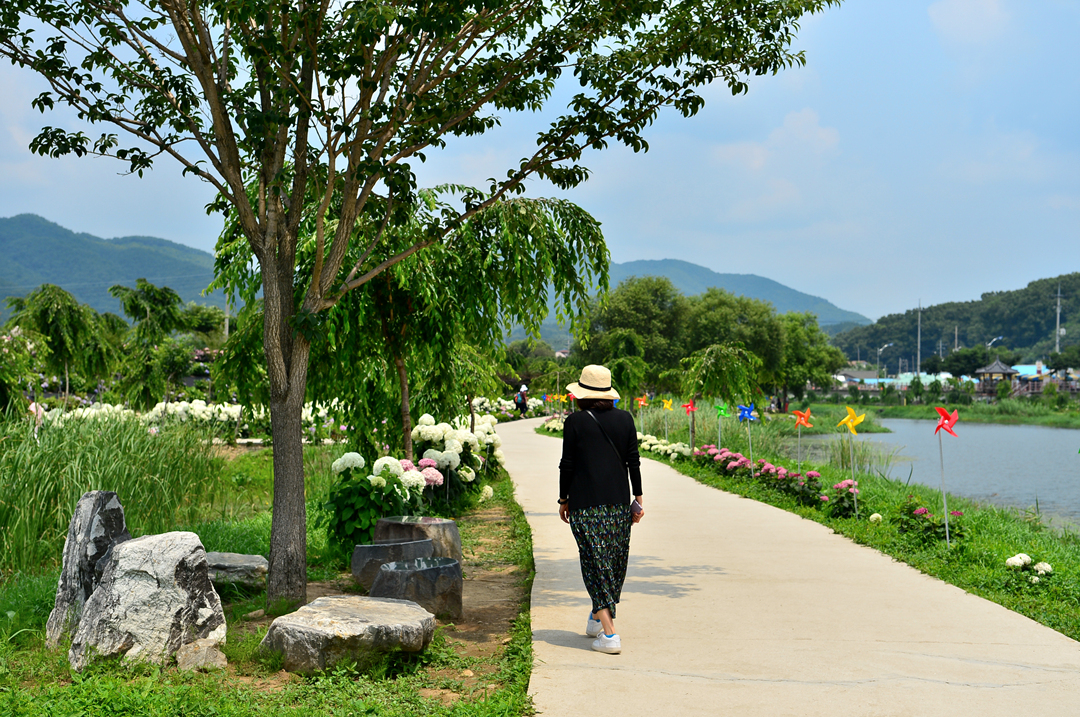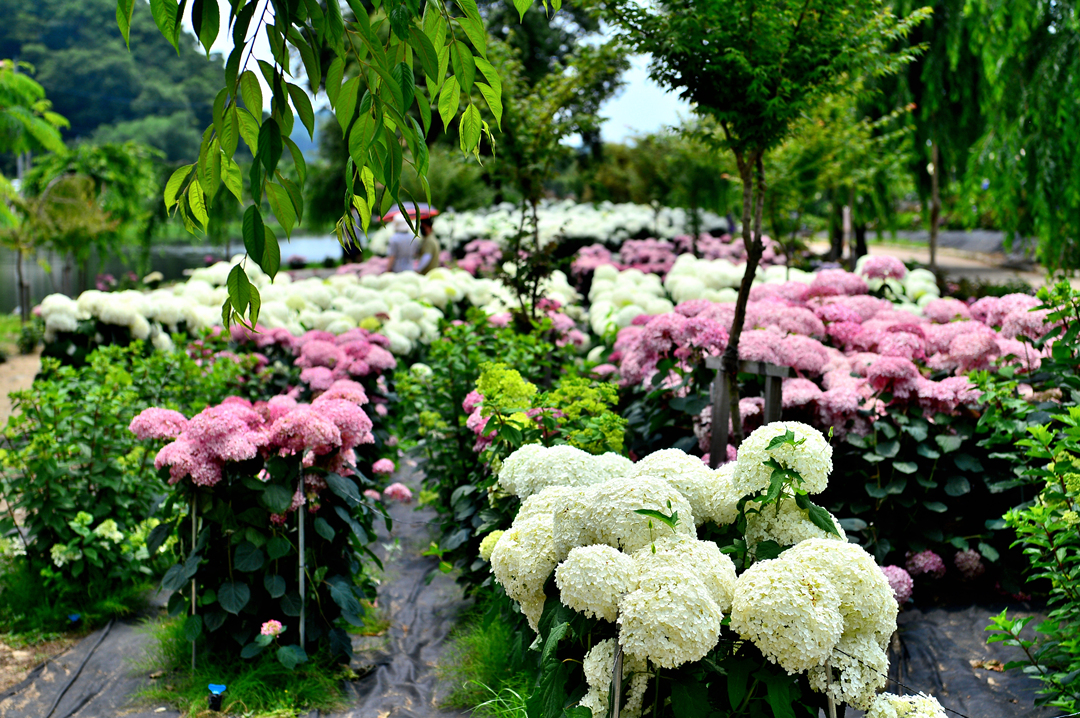 유구천 약 1km 구간에 펼쳐진 유구 색동 수국 정원은 수국 약 22종, 16,000본을 심어놓은 중부권