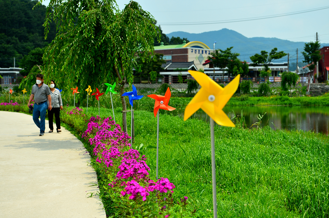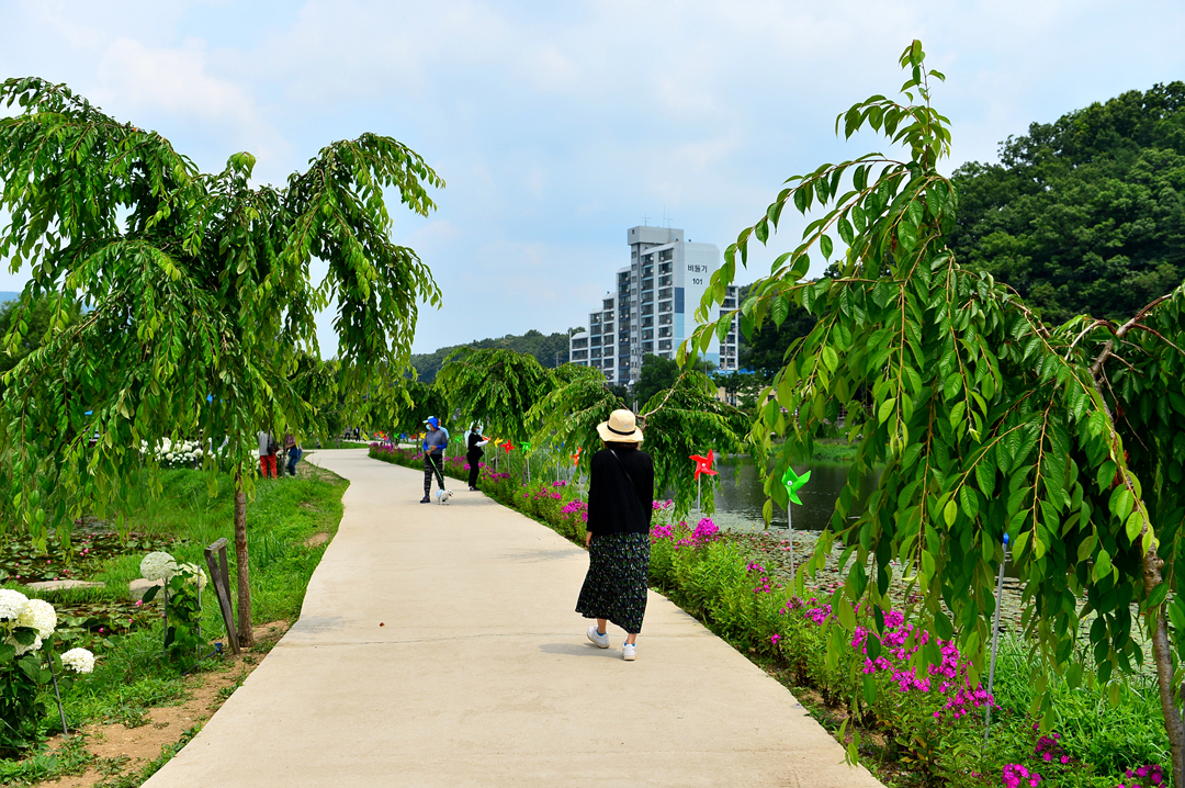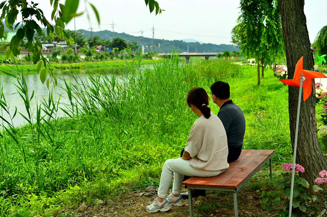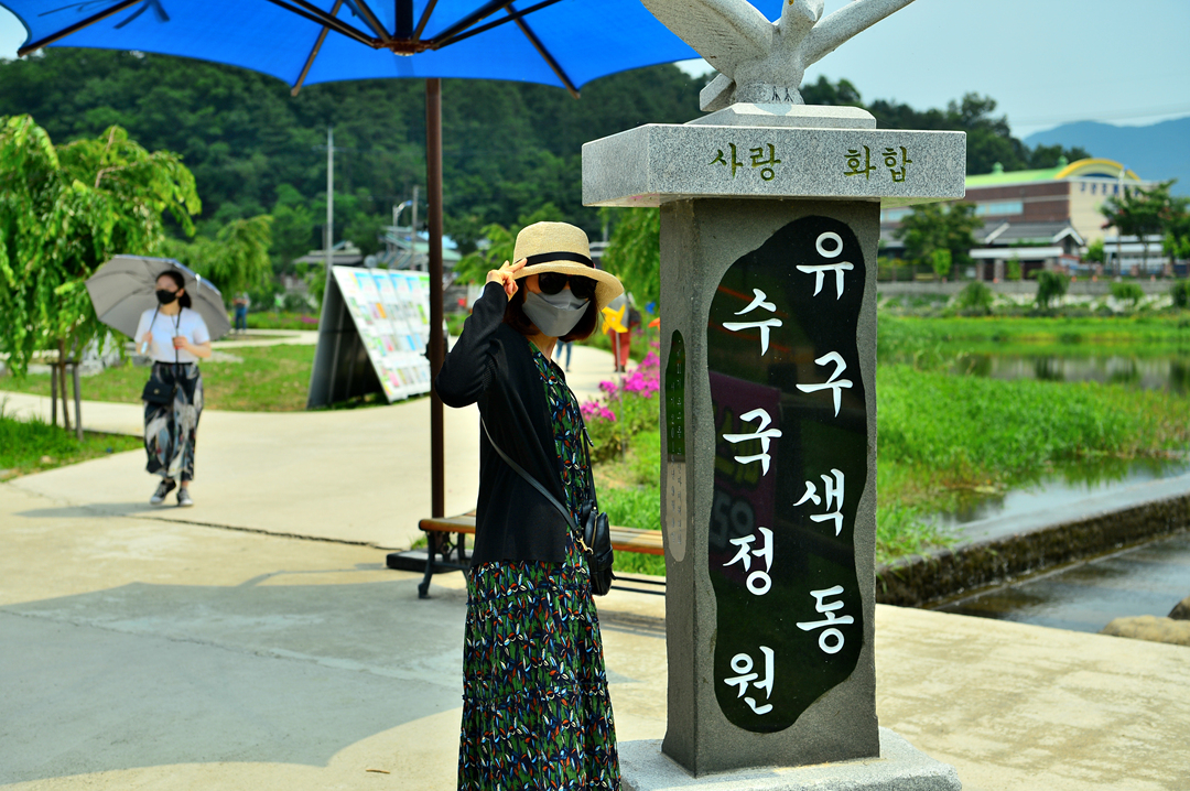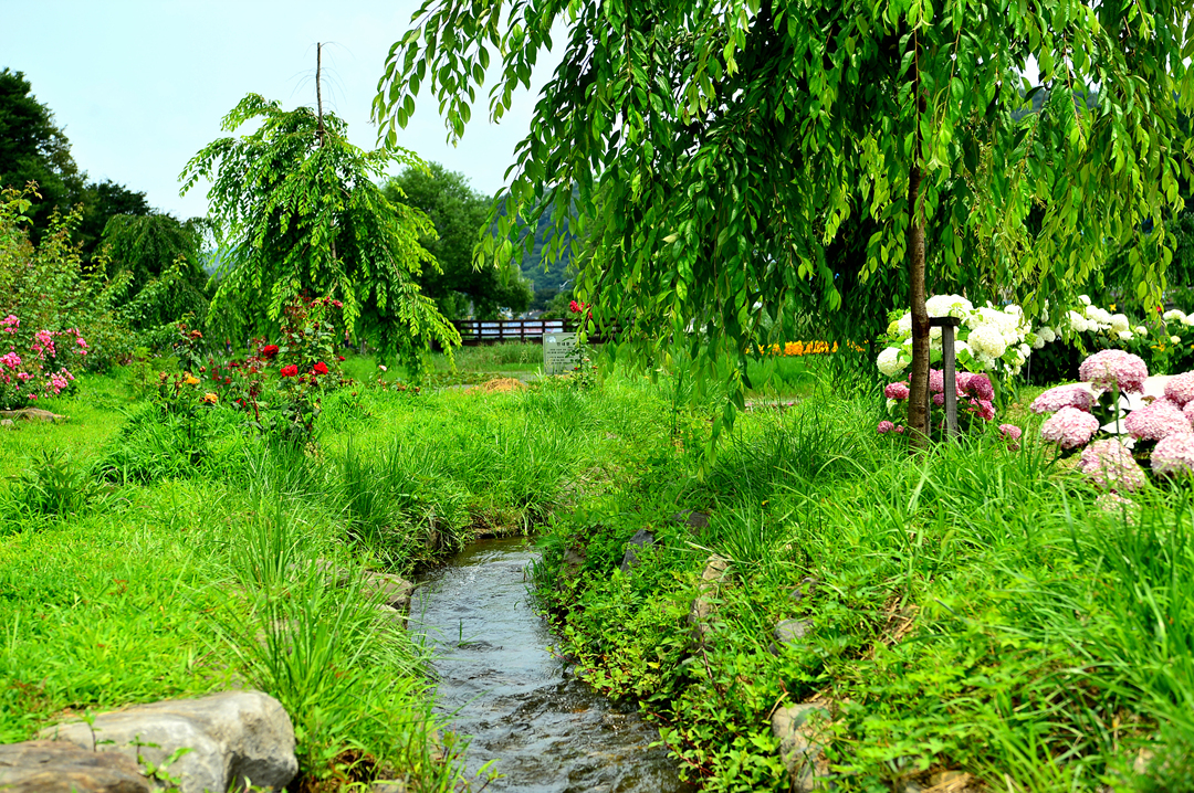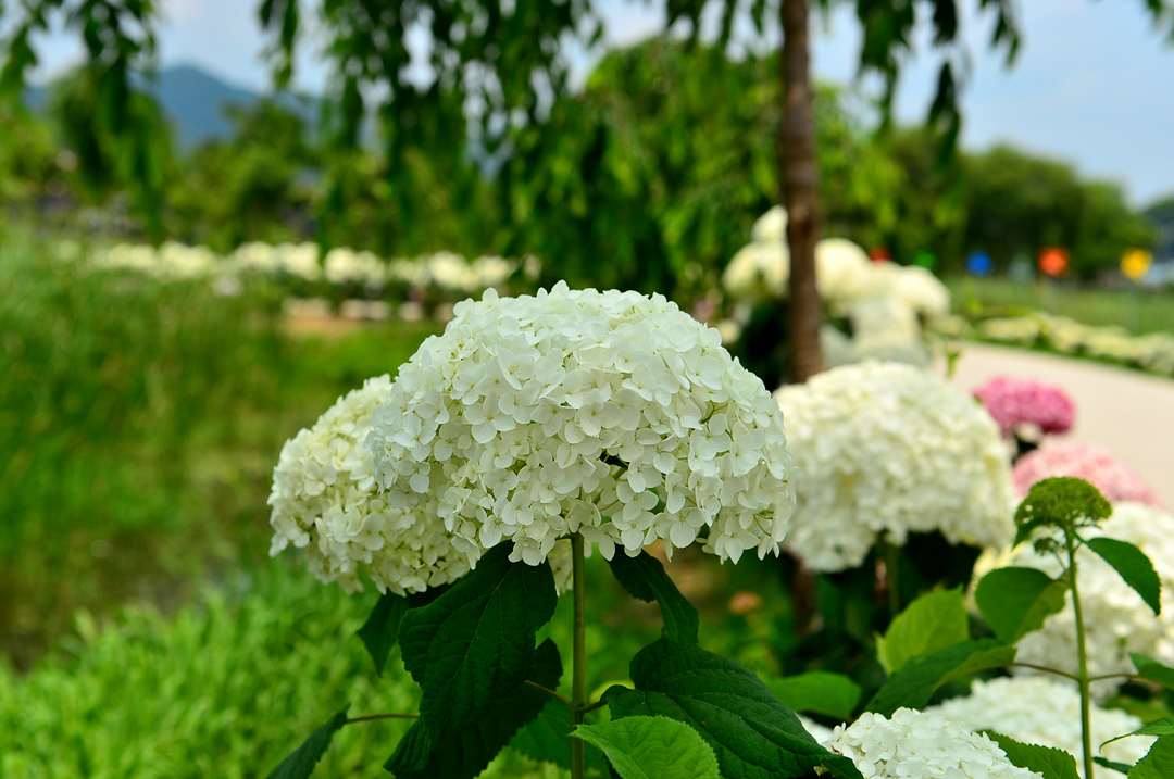 유구천 약 1km 구간에 펼쳐진 유구 색동 수국 정원은 수국 약 22종, 16,000본을 심어놓은 중부권