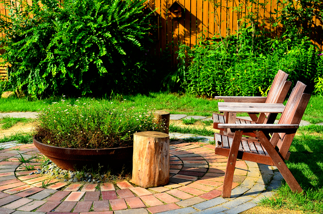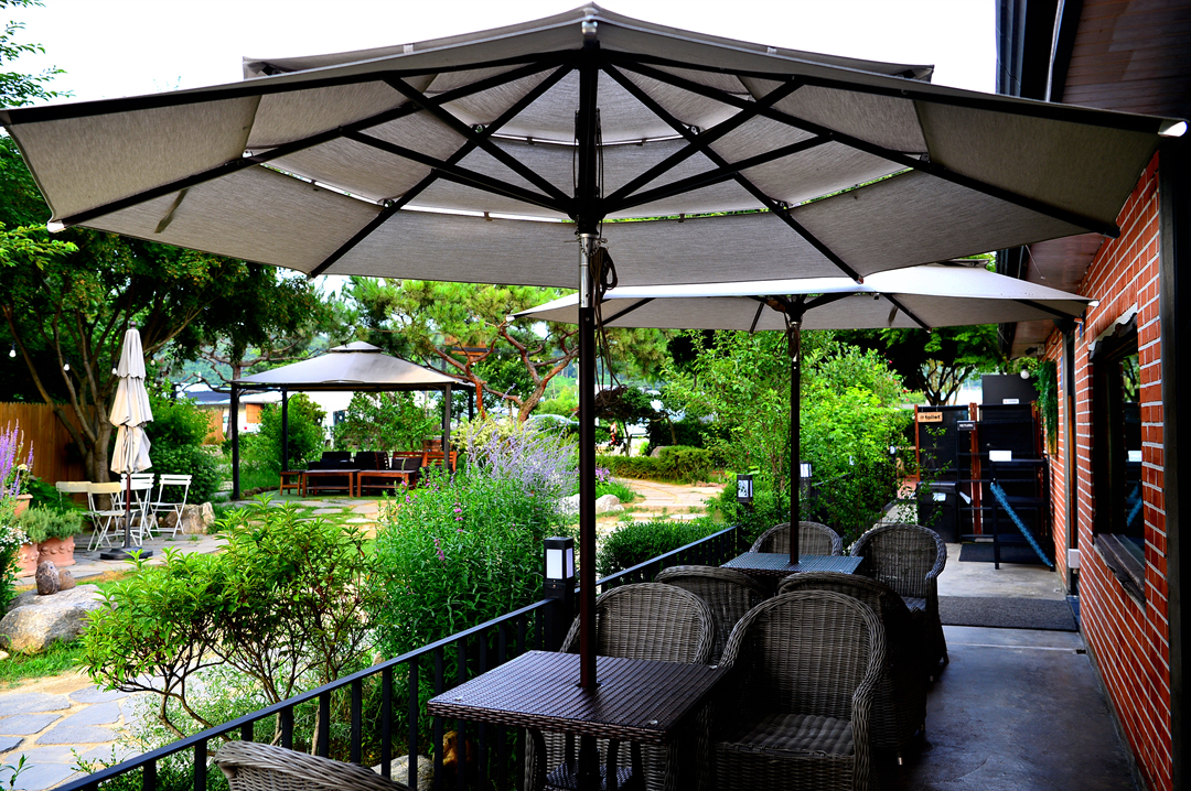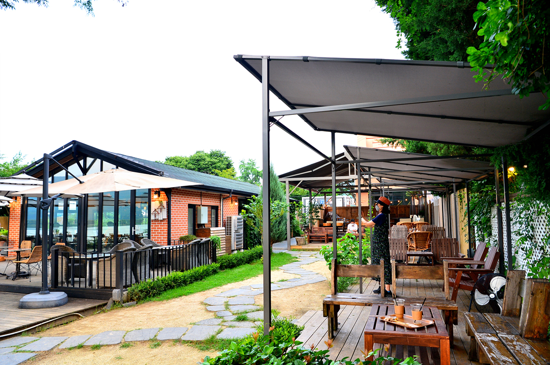 카페 건물 주변으로 다양한 형태의 야외 테이블을 배치해 놓고 있다.
