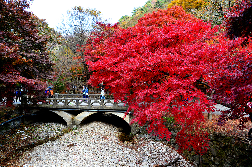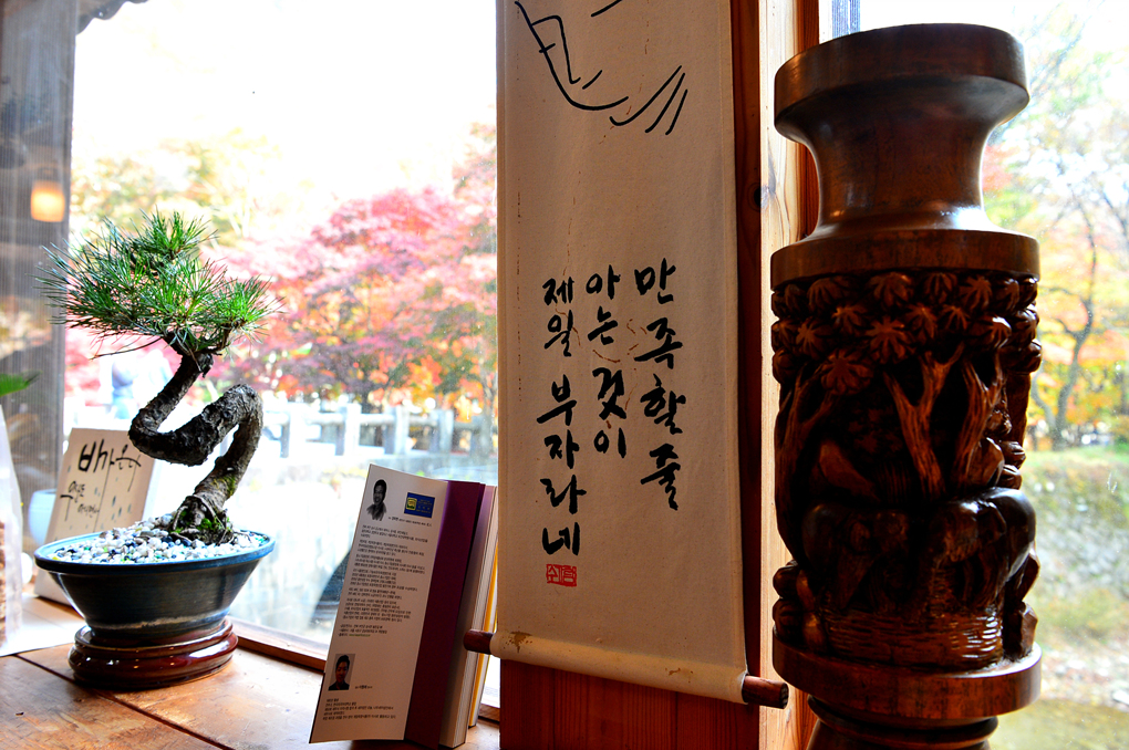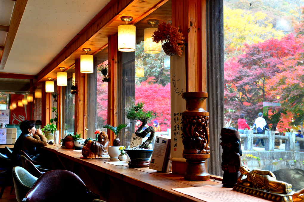 찻집 앞의 석교에도 빨간 단풍이 곱게 내려앉았다.