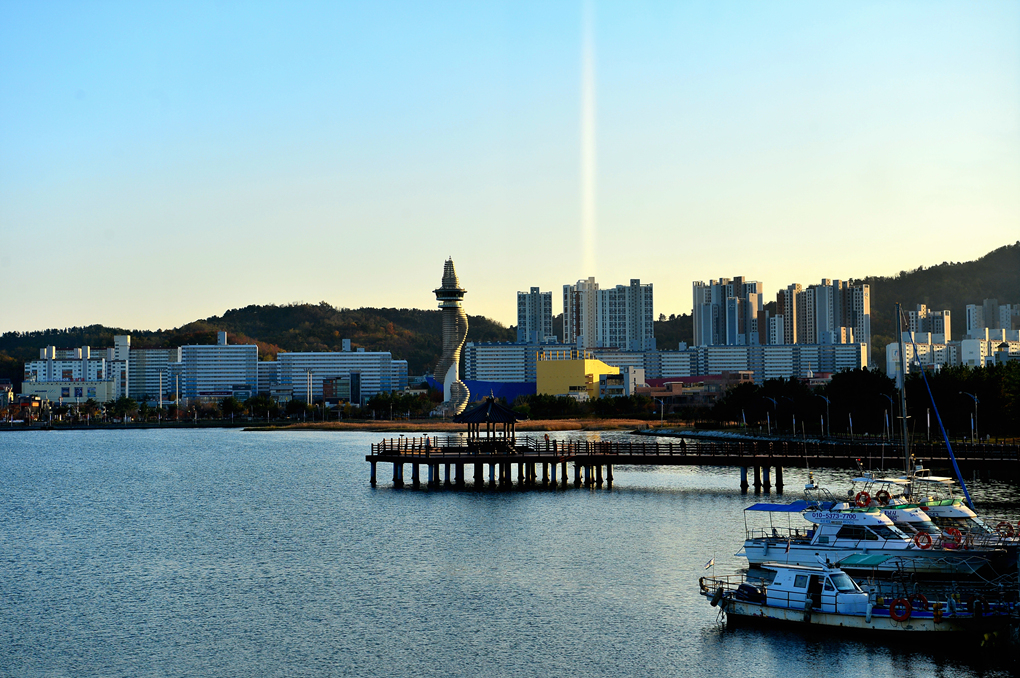 카페 창밖으로 청초호 건너편의 엑스포 상징탑도 보인다.