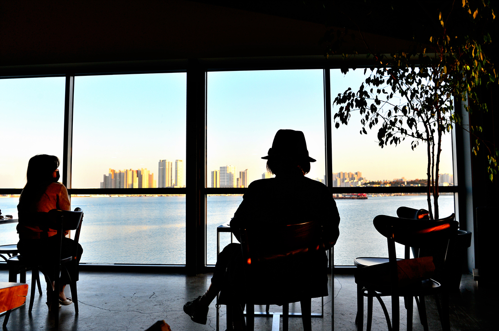 카페 창밖으로 보이는 청초호 주변의 다채로운 풍경들이다.
