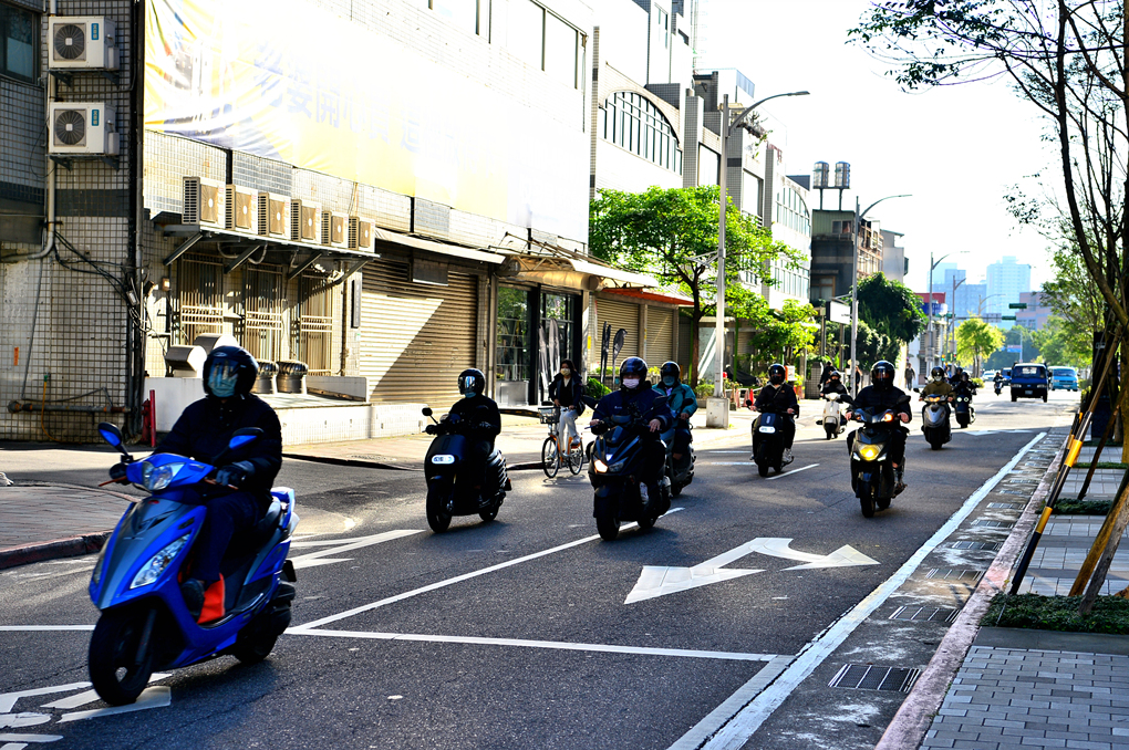좌측의 도로에서 직진 신호와 좌회전 신호가 켜졌을 때, 직진 차선에 있던 오토바이들이 곧바로 좌회전을 하지 않고 그대로