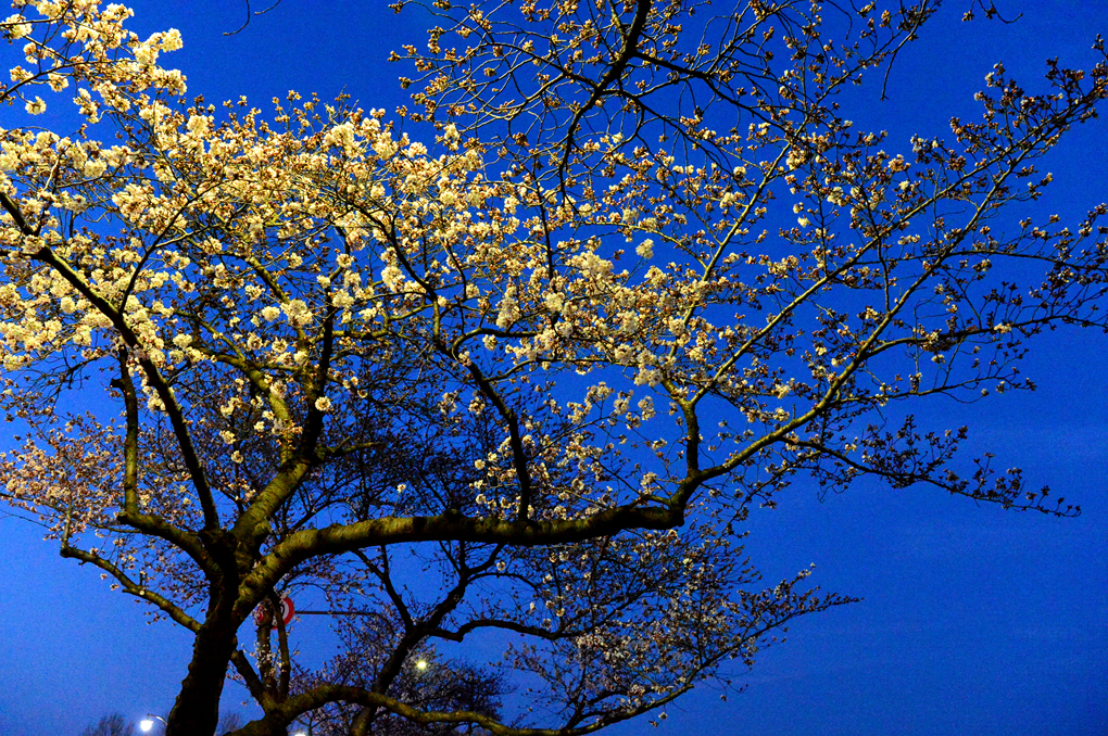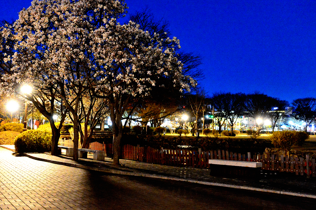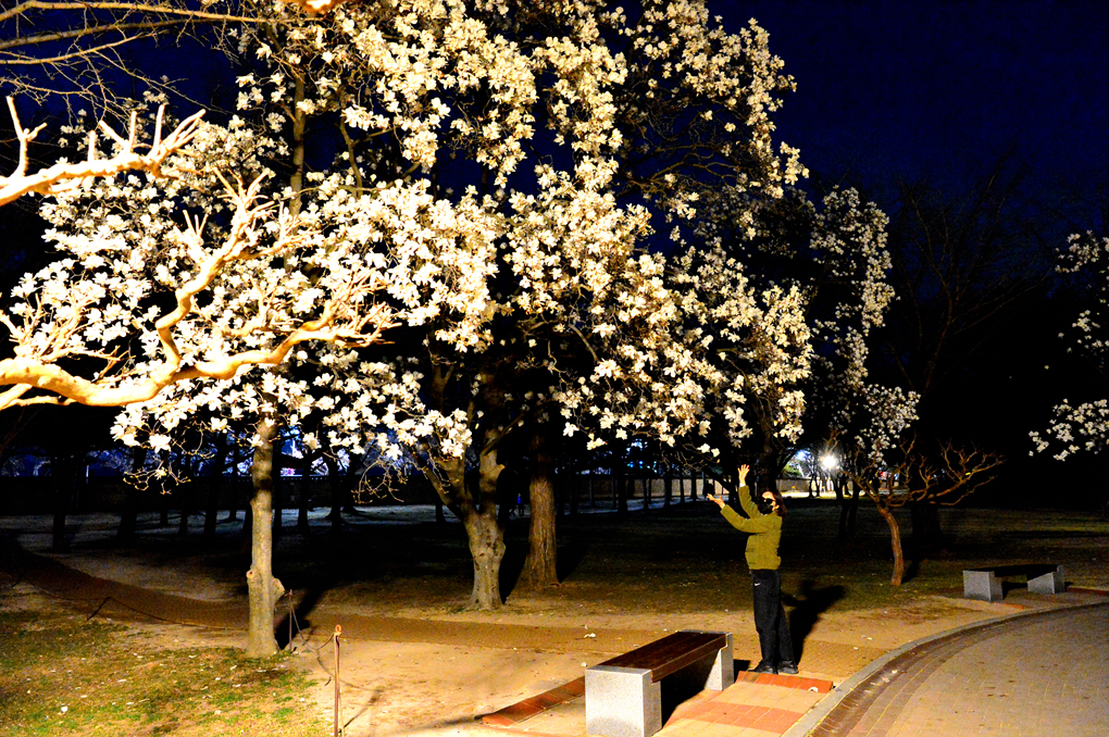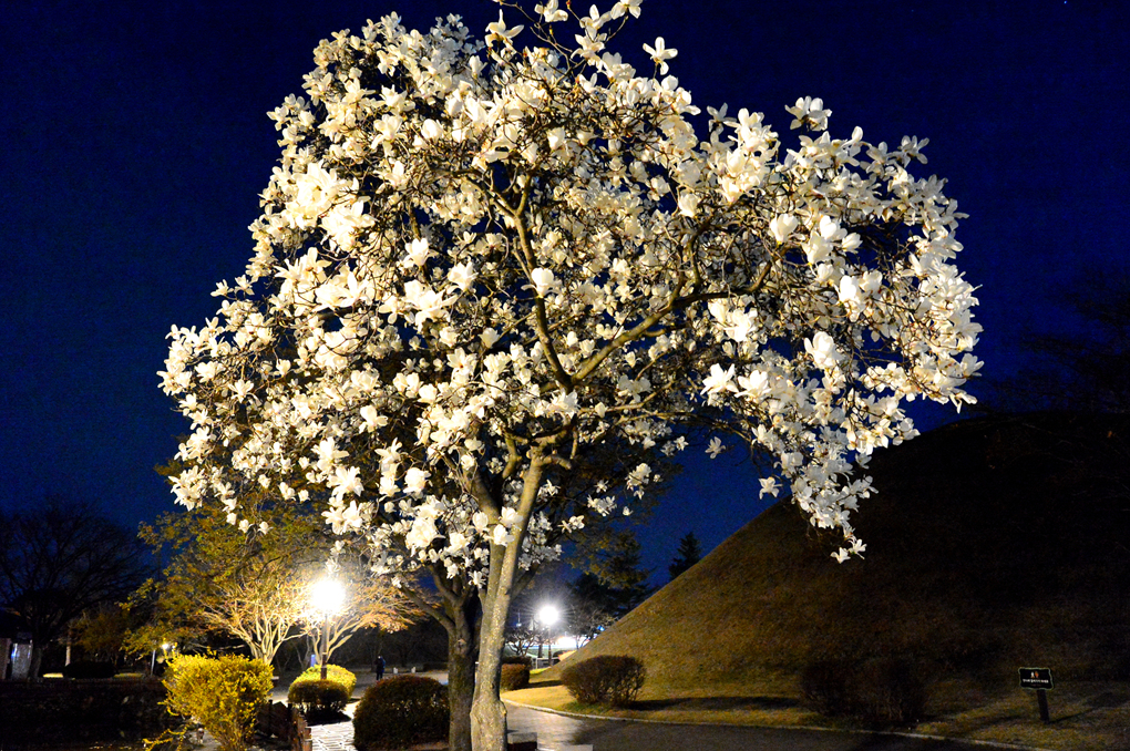 밤하늘의 하얀 목련꽃이 조명을 받아 더욱 아름다운 빛을 발하고 있다.
