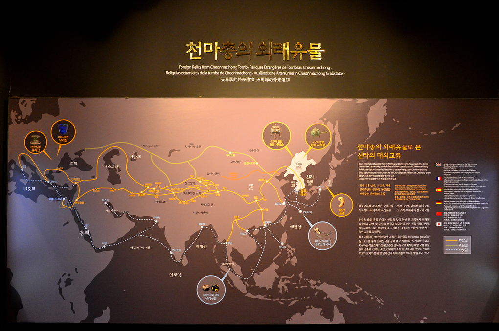 천마총에서 출토된 외래문물로 유추해 본 신라의 대외 교류도인데, 실로 먼 지역까지 광범위한 교역이 이루어졌음을 알려