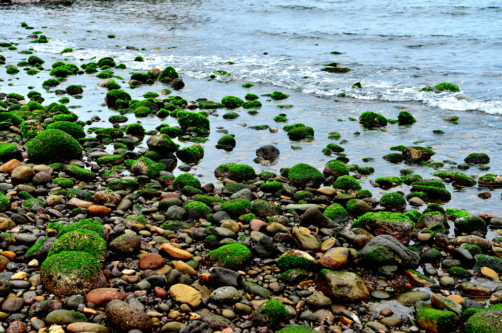 몽돌 위의 해초류가 싱그럽게 다가온다.