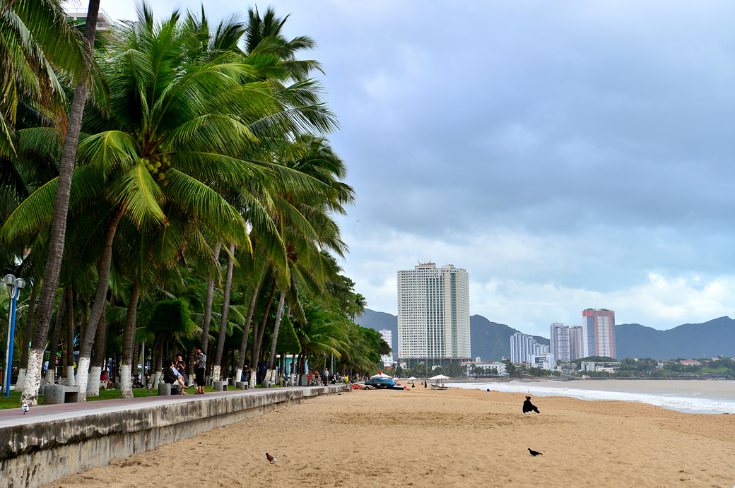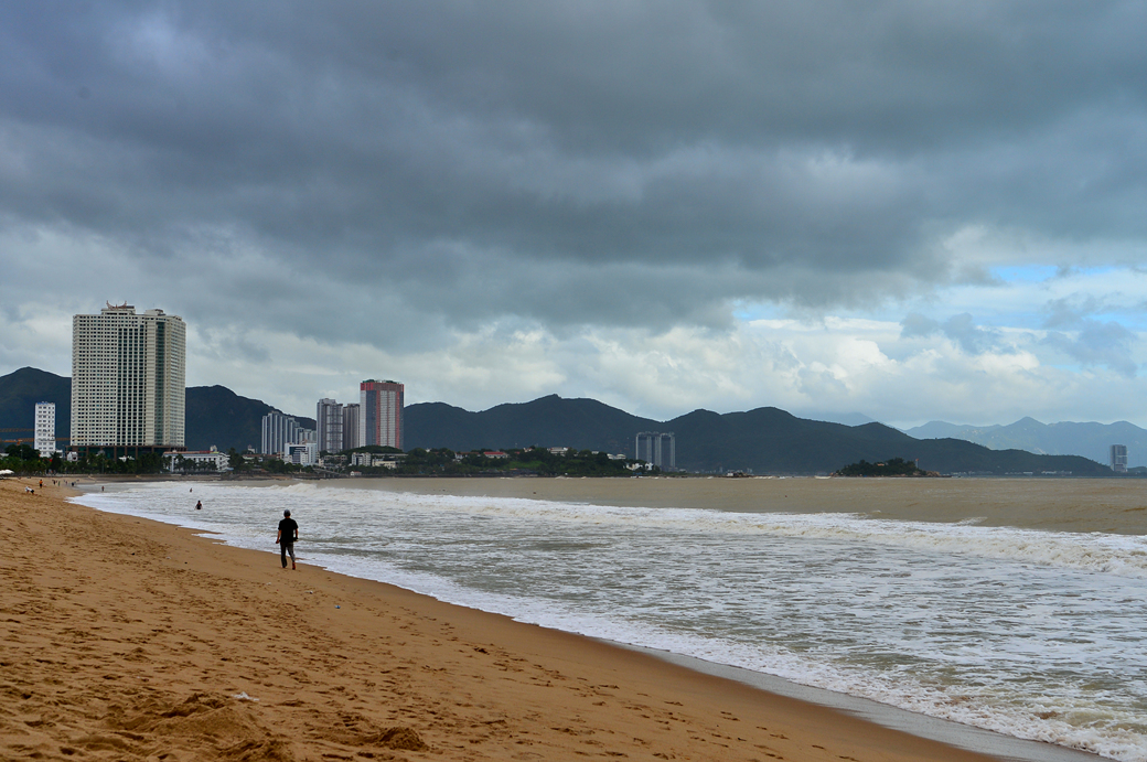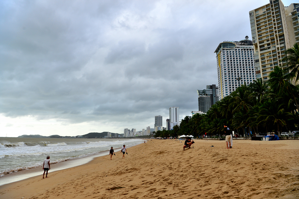 낮고 짙게 드리워진 구름 아래로 나트랑의 드넓은 해변이 펼쳐져 있다.