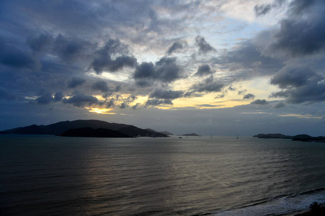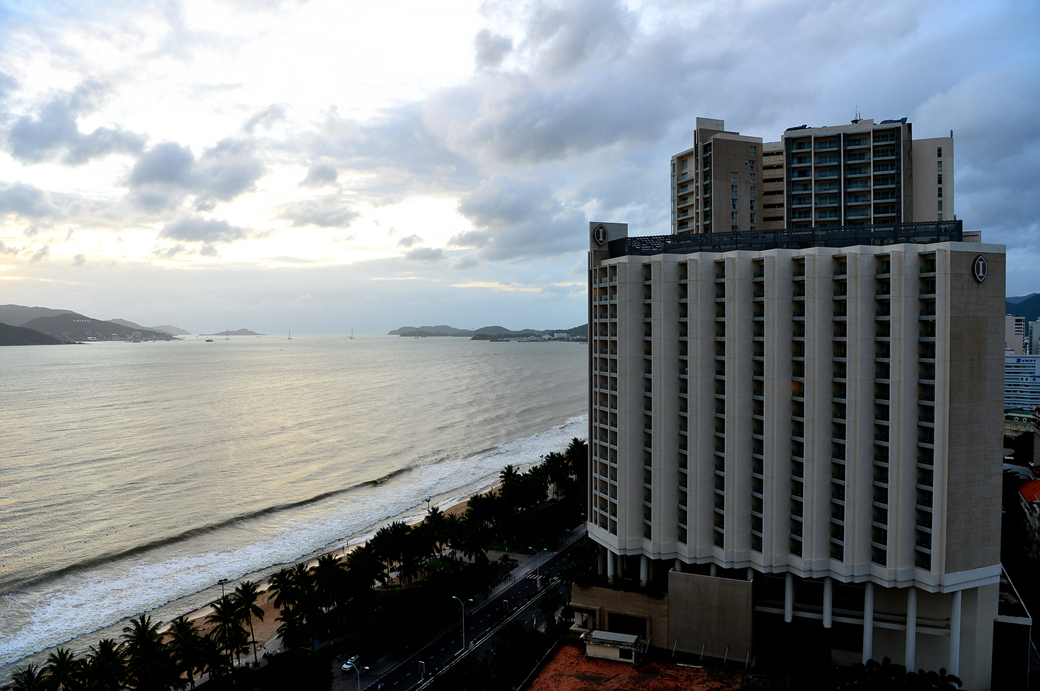 다음날 아침 창밖으로 보이는 나트랑 해변 모습인데, 드넓은 바다 위로는 짙은 구름이 드리워져 있다.