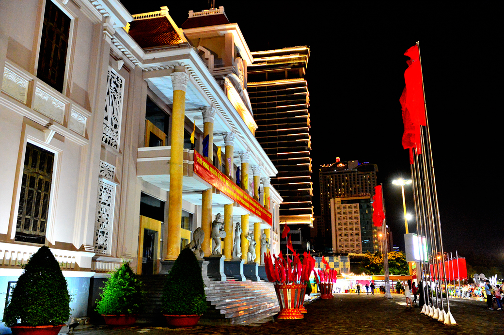 냐짱 해변 도로에 있는 근사한 건물, 베트남 국기가 즐비하게 게양되어 있는 걸 보니 관공서쯤 되나 보다.