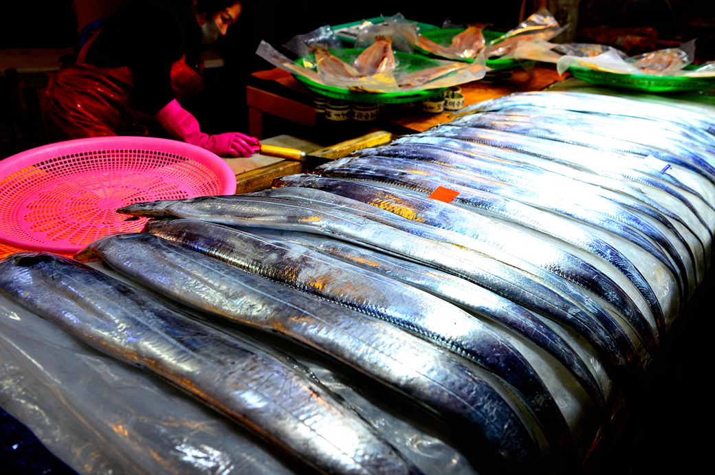 매대를 가득 채우고 있는 싱싱한 은갈치~
