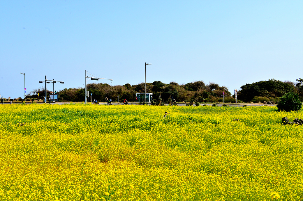 성산 일출봉이 바라보이는 광치기 해변 맞은편의 아름다운 유채꽃밭이다.