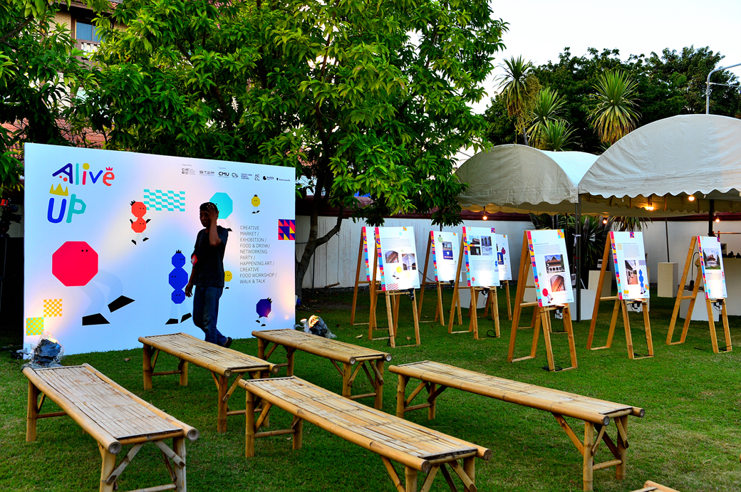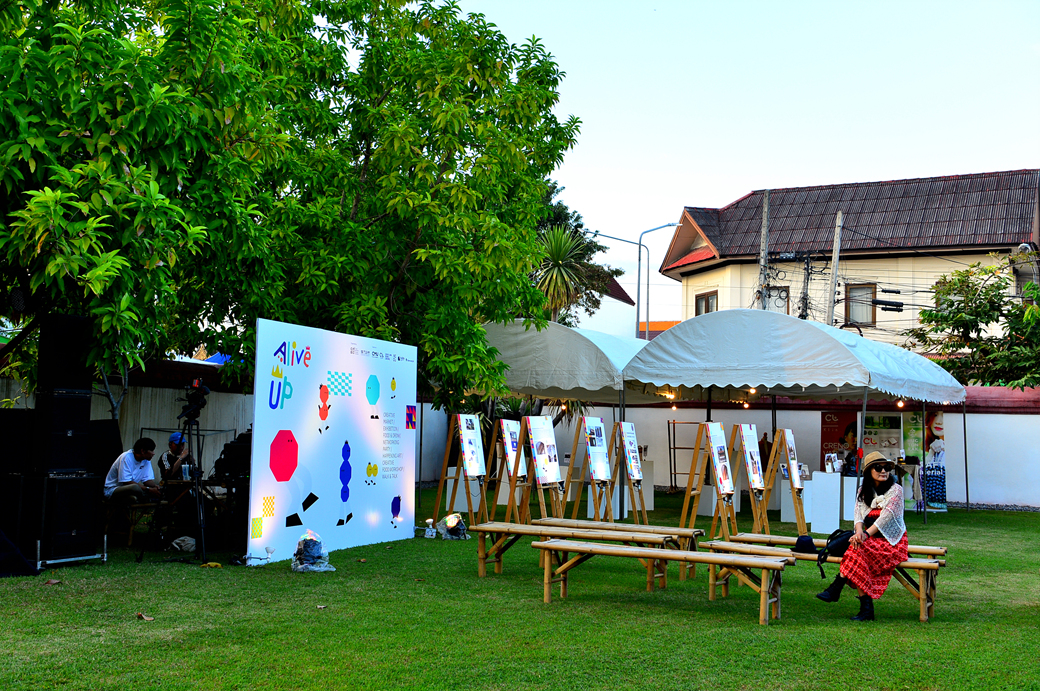 작은 무대 뒤는 아름다운 오색 천으로 장식되어 있고, 무대 앞 공간에는 란나 스타일의 각종 건축물들의 사진과