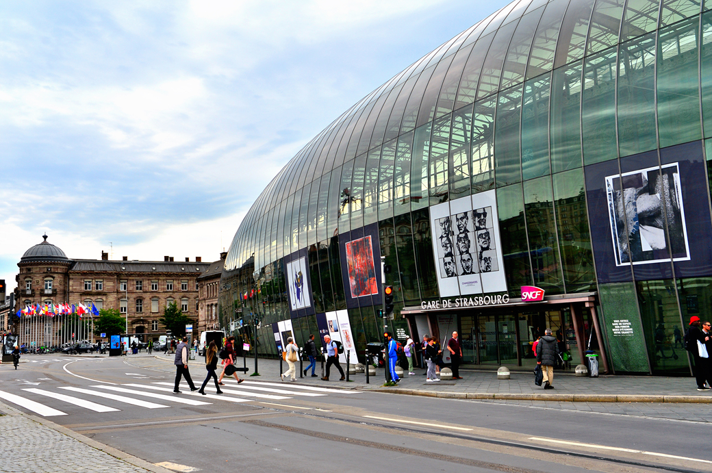 전면을 온통 유리 커튼월로 감싼 스트라스부르 역 전면이다.