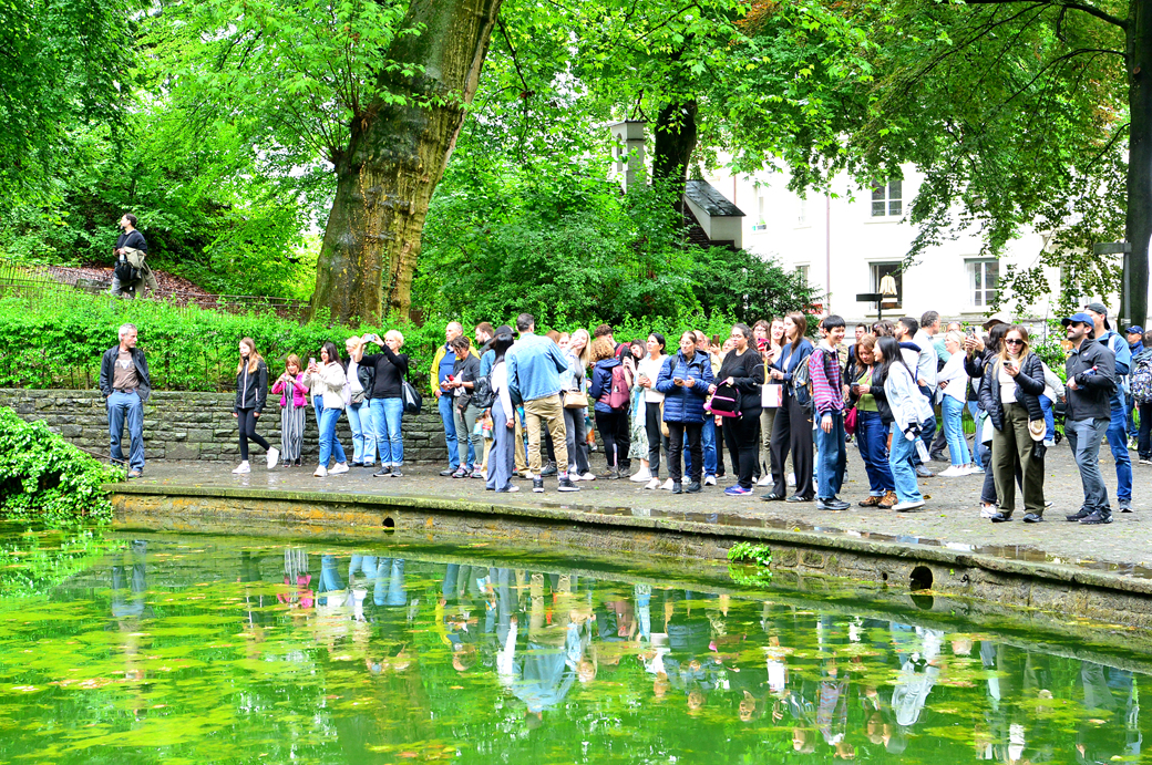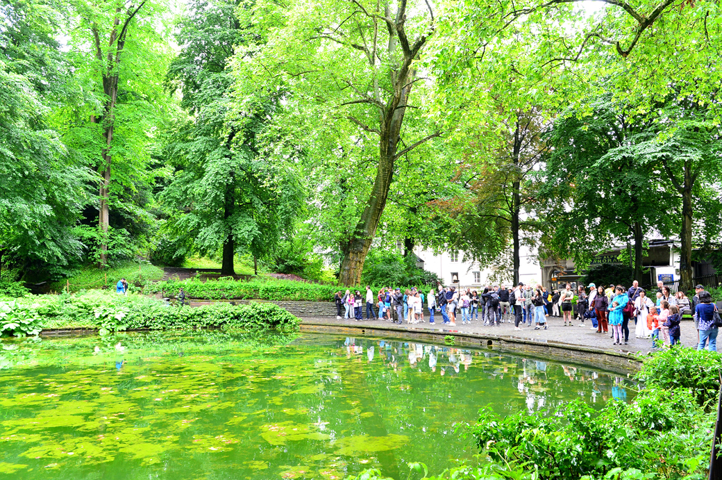 사자상 아래의 연못과 사자상을 바라보는 관광객들 모습이다.