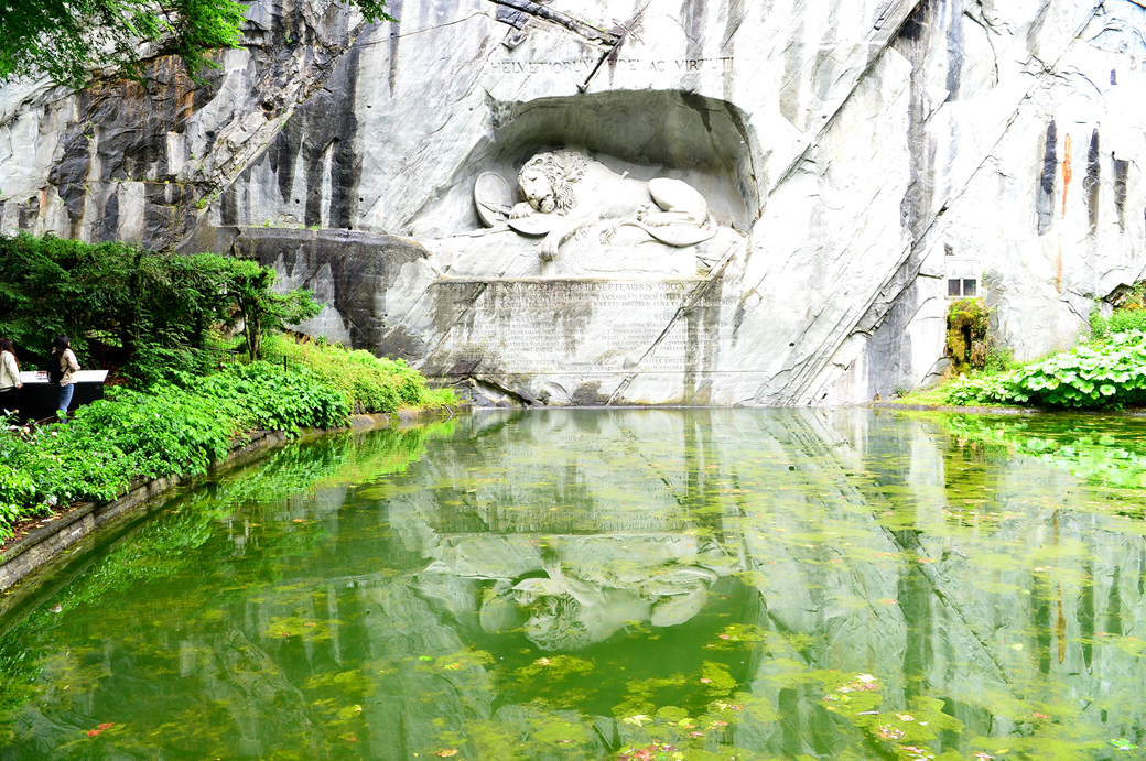 등에 창을 꽂은 채 부르봉 왕가의 문장이 새겨져 있는 방패를 가슴에 안고 있는 사자가 처연한 표정으로 쉬고 있는 조각으로, 덴마크의 유명 조각가 베르텔 토르발트젠 Bertel Thorvaldsen의 디자인을 루카스 아른 Lukas Ahon이 조각한 작품이라고 하는데~