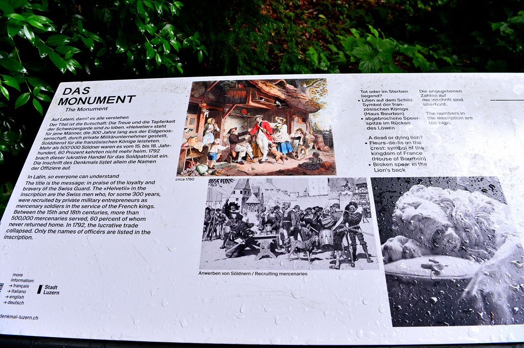 이곳의 비문에는 스위스 근위대의 충성심과 용맹함을 찬양하는 메시지도 기록되어 있는데, 비문에 나오는 "헬베티"는 약 300년 동안 프랑스 왕을 위해 사립 군사 기업가들에 의해 용병으로 모집되었던 스위스 남성들이라고 한다. 15세기에서 18세기 사이에 50만 명이 넘는 용병들이 프랑스에서 복무했으며, 그중 60%는 고국으로 돌아오지 못했다고 한다. 1792년에 수익성이 좋은 이 무역은 붕괴되었고, 비문에는 장교들의 이름만 나와 있다고 한다.