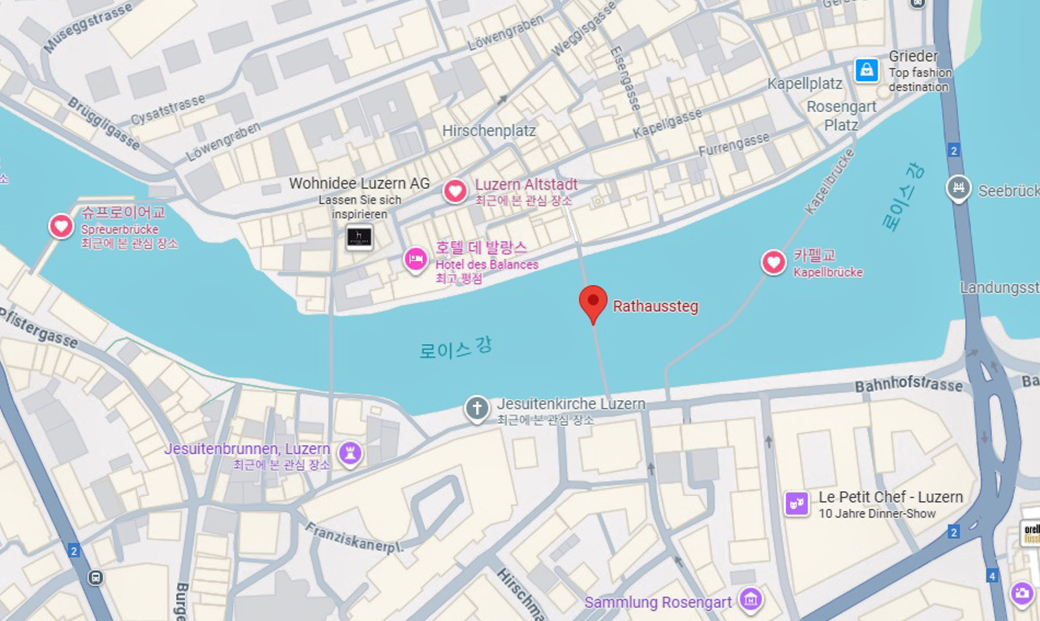 로이스 Reuss 강 위의 다리들과 우리가 카펠교를 조망하고 있는 다리 위치다.