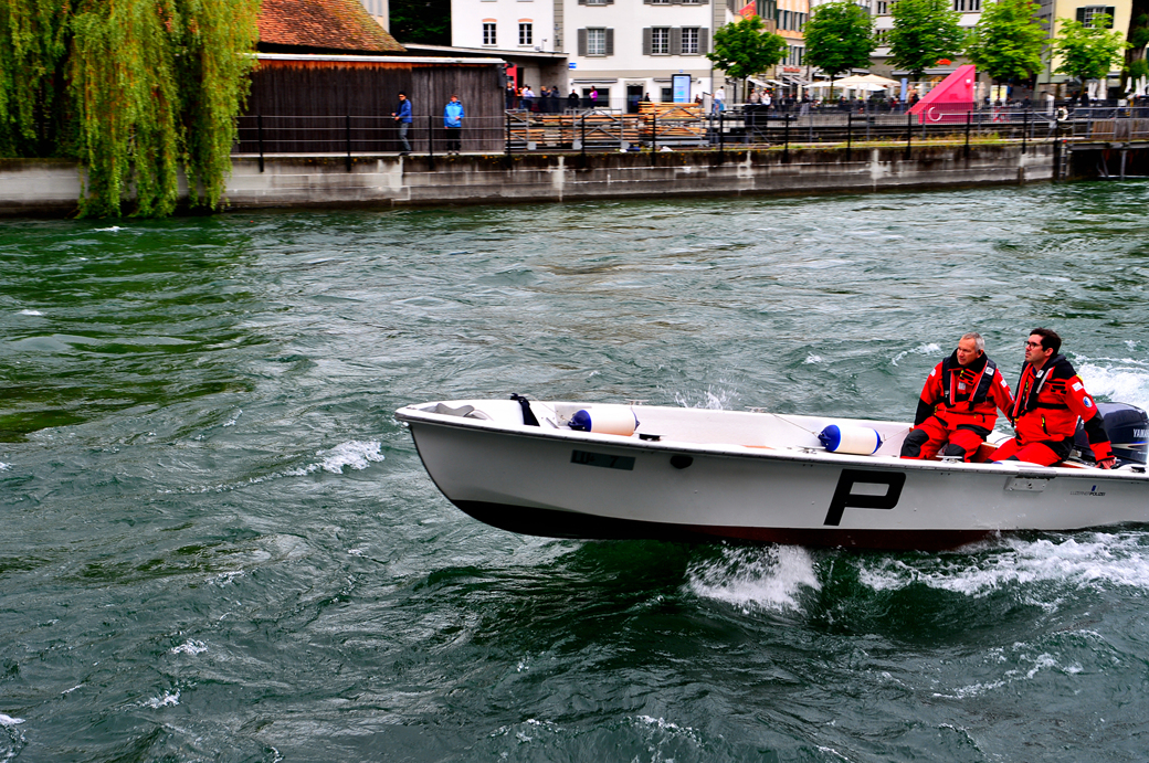 강을 빠르게 질주하는 보트가 보이는데, 복장을 보니 관리자들인 모양이다.